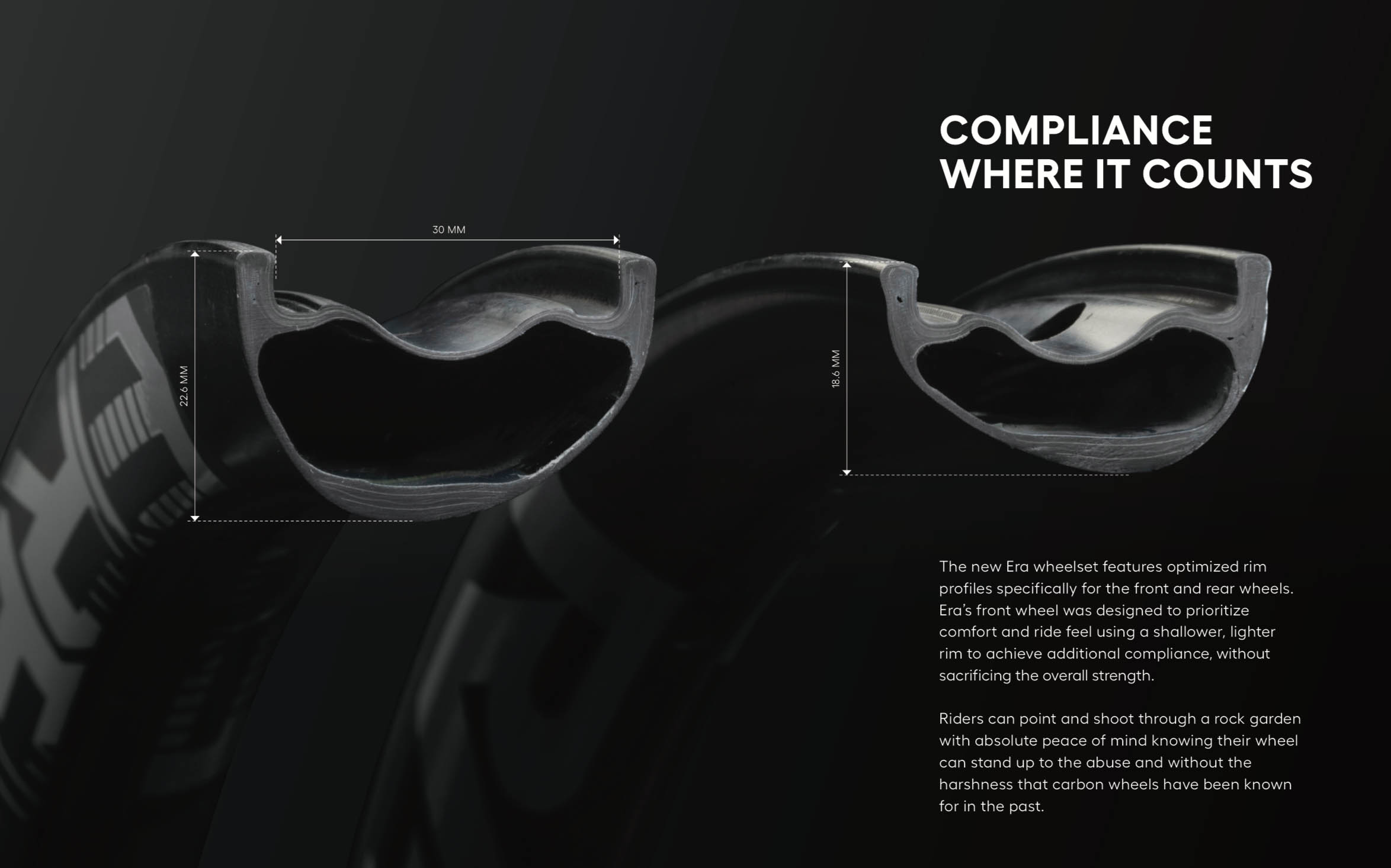 Les nouvelles roues Race Face Era carbone, qui se destinent à un usage enduro/trail, se placent exactement dans la même philosophie de développement que les cintres. Les roues Race Face nous ont toujours paru fort raides quand nous les avons roulées et on se réjouit que la marque semble changer radicalement son fusil d’épaule. Pour autant, elle n’a pas voulu mettre le curseur à fond du côté tolérant et confortable, comme des Zipp 3Zero Moto par exemple. Race Face a plutôt chercher à être « deuxième partout » (en poids, tolérance, réactivité, etc) pour au final être numéro 1 au classement combiné de toutes les caractéristiques qui font une bonne roue.