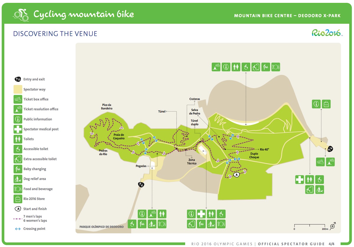 La piste de VTT, longue de 4,85km, est située dans le complexe de Deodoro, proche des pistes de BMX et de Canoë Slalom. Il s’agit d’un circuit rapide et entièrement artificiel, mais que les pilotes décrivent comme ludique et qui comporte quelques belles sections rocailleuses. On peut regretter qu’il ne soit pas plus représentatif de ce que les pilotes rencontrent le reste de la saison, mais les impératifs de production TV et de proximité avec le reste des épreuves imposent des compromis. Il promet en tout cas d’être spectaculaire et on attend près de 25.000 personnes sur place !