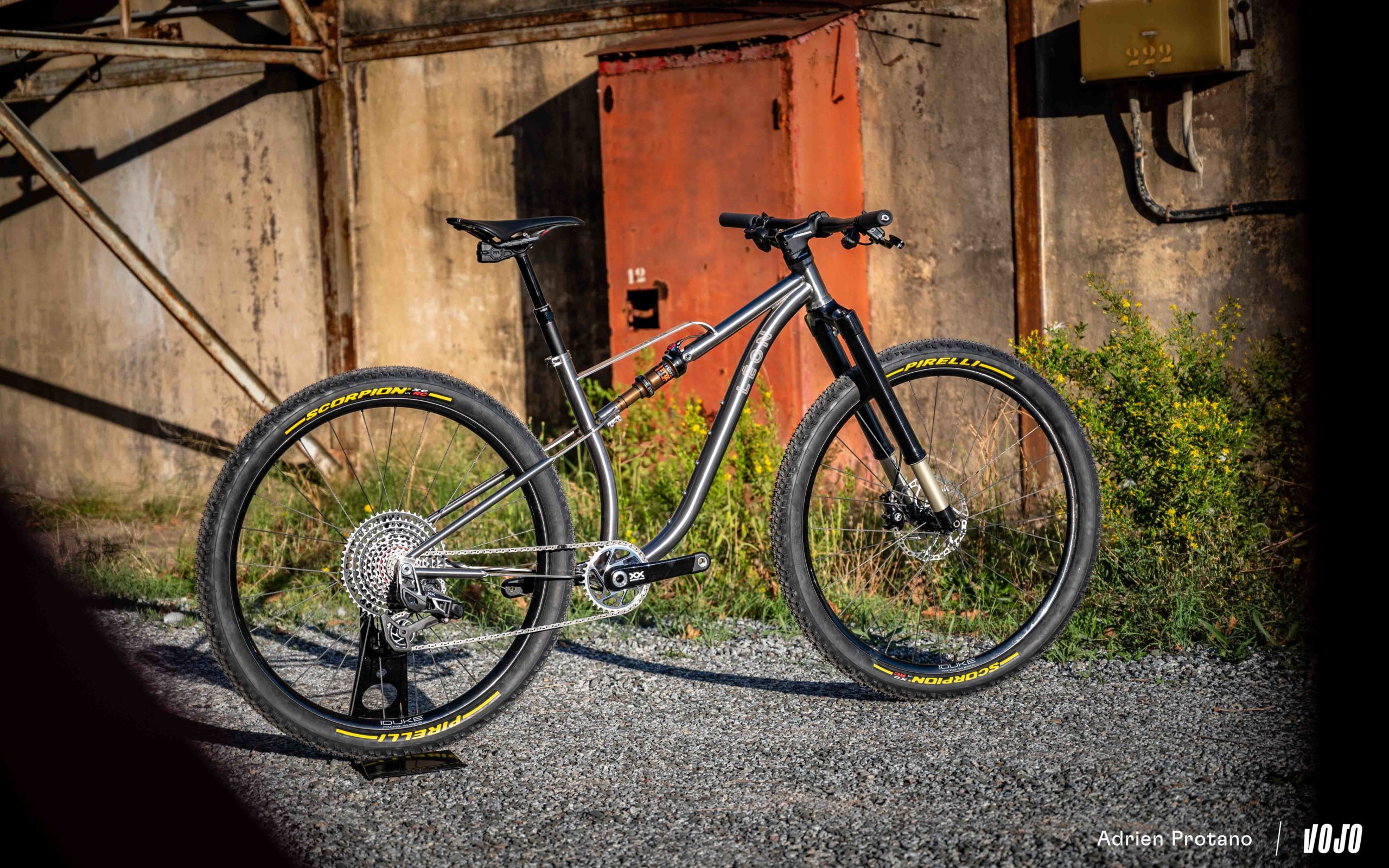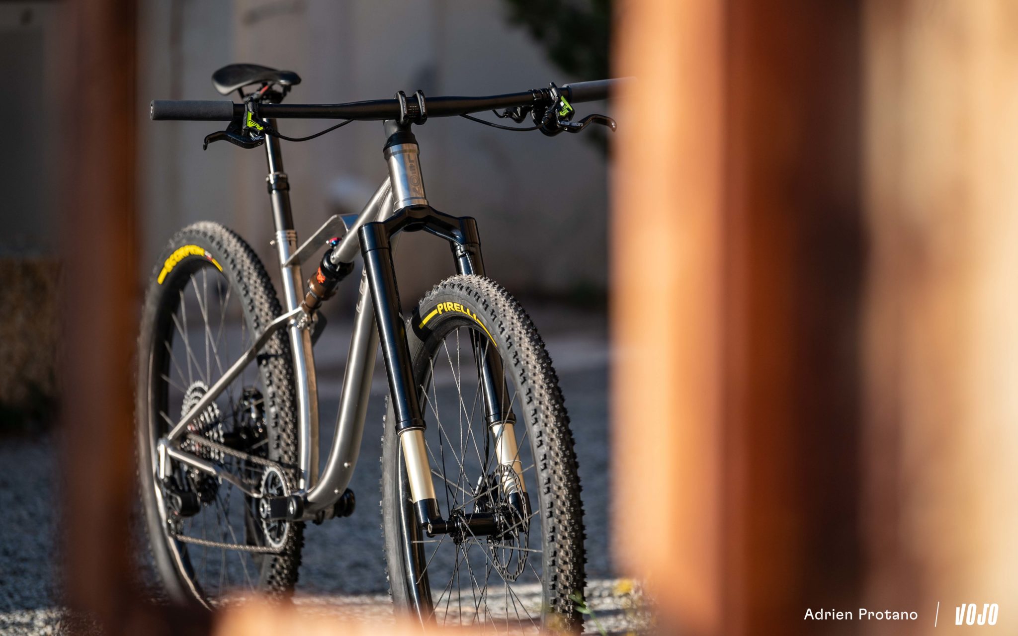 Le Semita est le châssis de cross-country/marathon tout-suspendu de la marque, ou du moins presque ! Car oui, le Semita est un softail… On ne retrouve pas de point de pivot à l’arrière du vélo : c’est le titane et ses propriétés élastiques qui apportent la souplesse nécessaire au fonctionnement de la suspension. Et ne croyez pas que le débattement est anecdotique ! Pour 2023, deux versions sont au programme : l’une offrant 93 mm de débattement, et une seconde bodybuildée où le débattement est porté à 123 mm par un simple changement de la course de l’amortisseur.