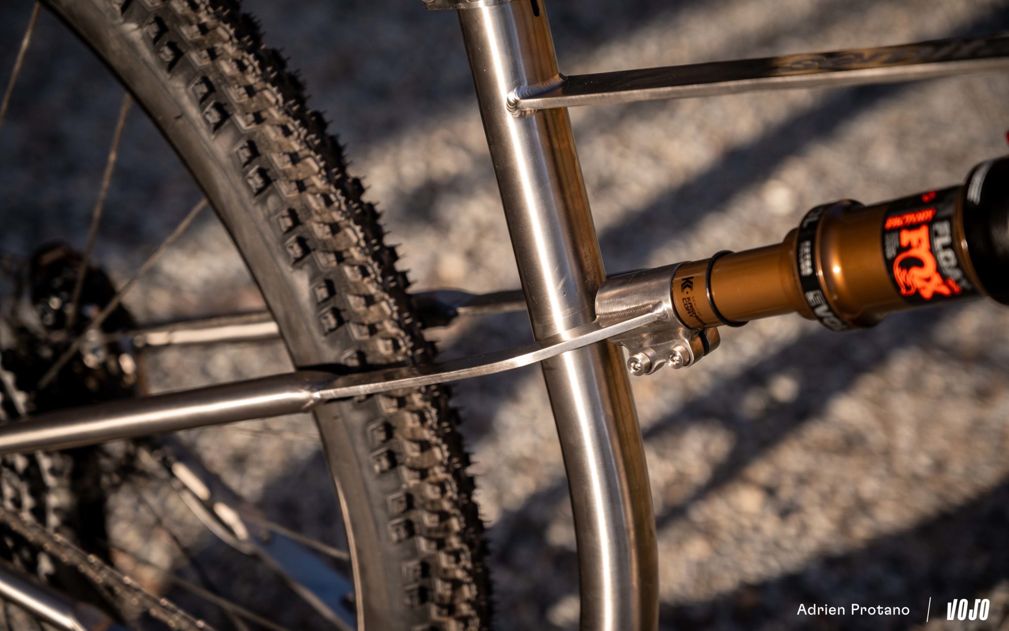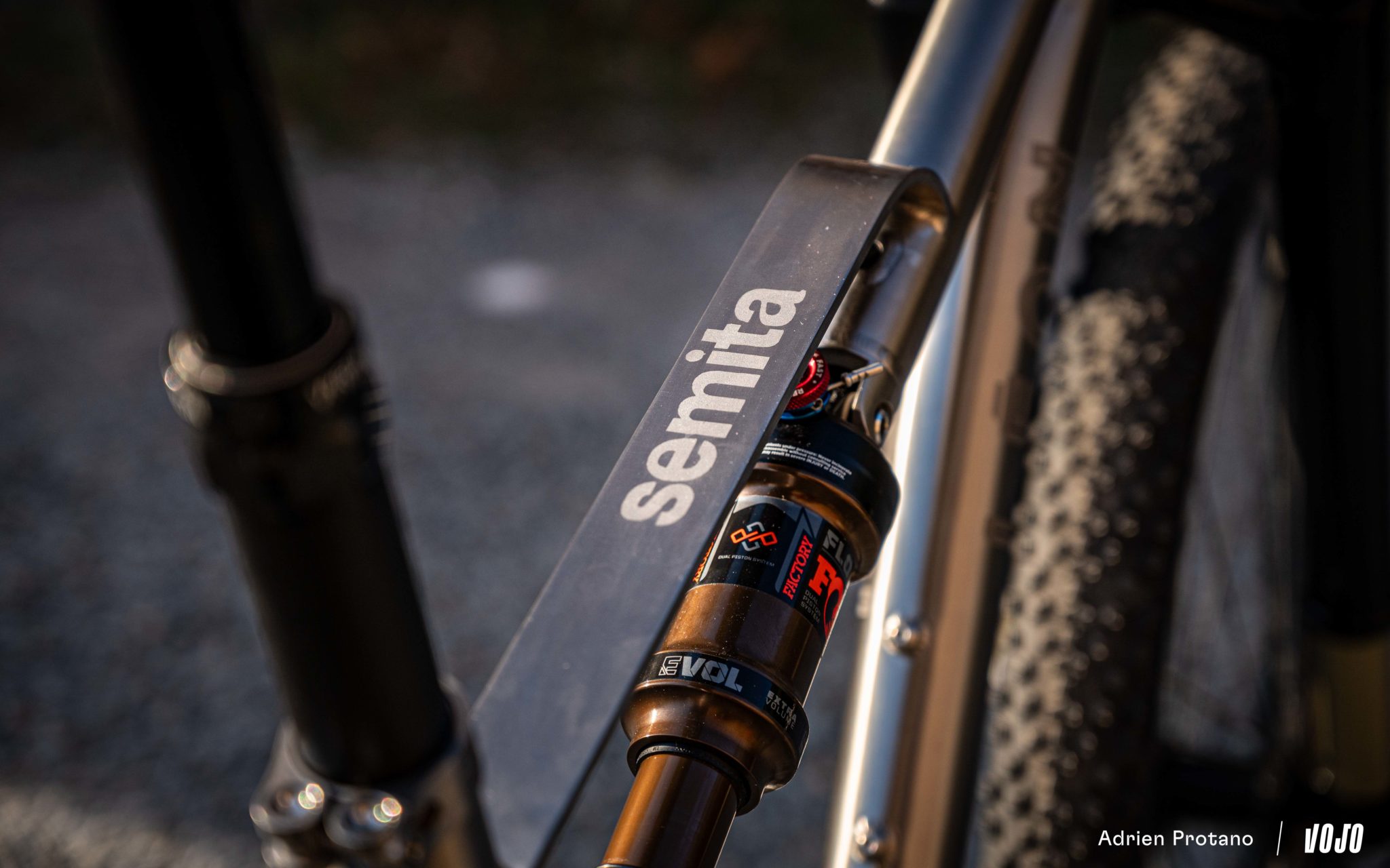 Les fins connaisseurs de la marque l’auront remarqué, les petites parties aplaties au niveau du bas des haubans ont disparu et c’est désormais en haut des haubans, près de l’amortisseur, que le flex se fait. Très large mais épaisse de seulement 4 mm, cette imposante lame permet à l’amortisseur de travailler toujours dans l’axe, même sur la fin de débattement. Pour ceux qui se poseraient des questions sur une potentielle usure prématurée de l’amortisseur avec un tel montage, David Robert répond que « l’expérience du Semita actuel montre qu’il n’y a pas de réel souci de fiabilité enregistré à ce niveau. Et le nouveau modèle est encore plus rigide et fait travailler l’amortisseur encore plus dans son axe. »
