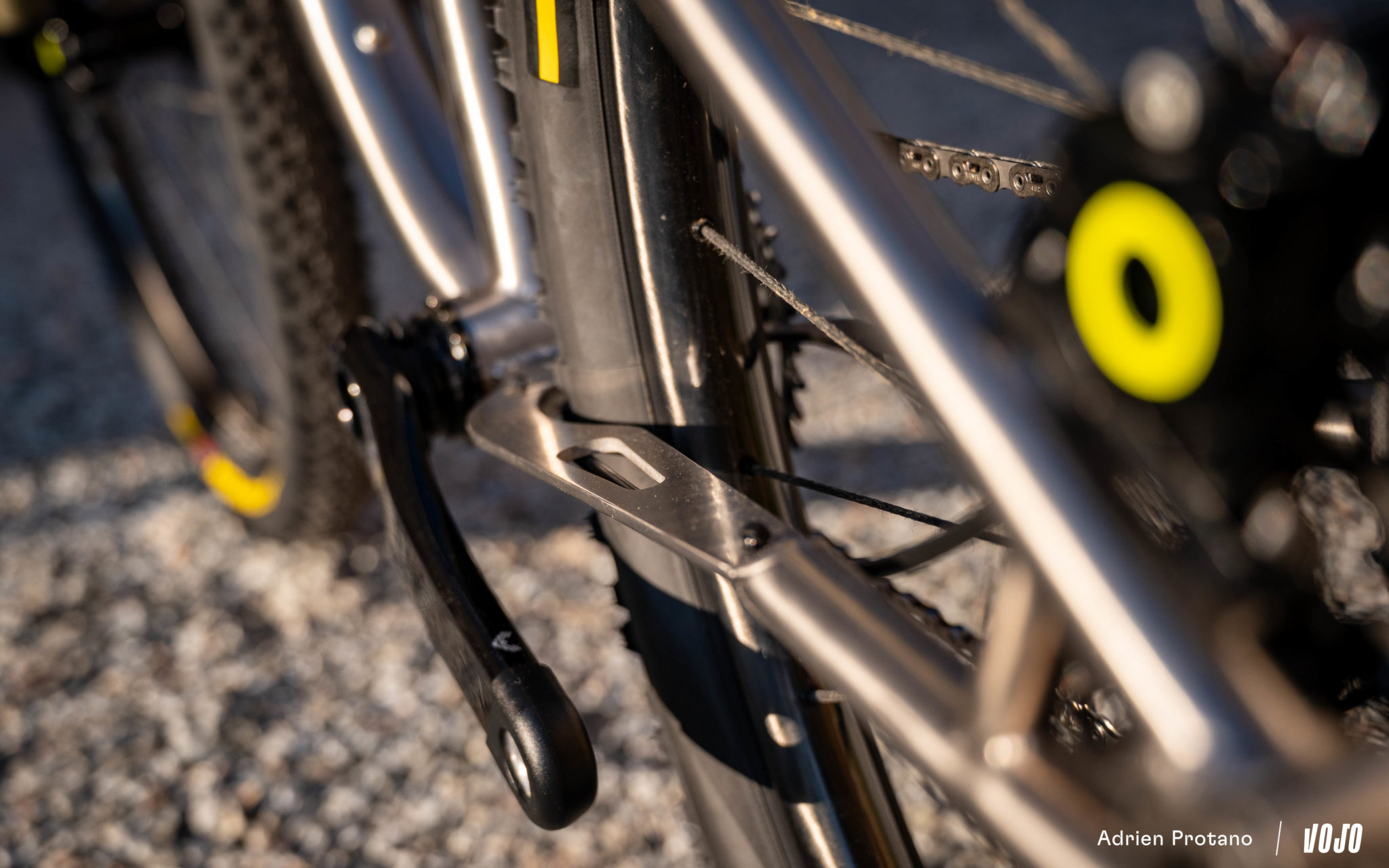 La plaque située entre les bases et le boîtier de pédalier a également été revue par rapport au Semita que l’on connaissait jusqu’à présent, et offre davantage de dégagement. Il faut également noter que le passage de la Durit de frein arrière est réduite à sa plus simple expression, avec uniquement deux petits points de fixation par collier de serrage.