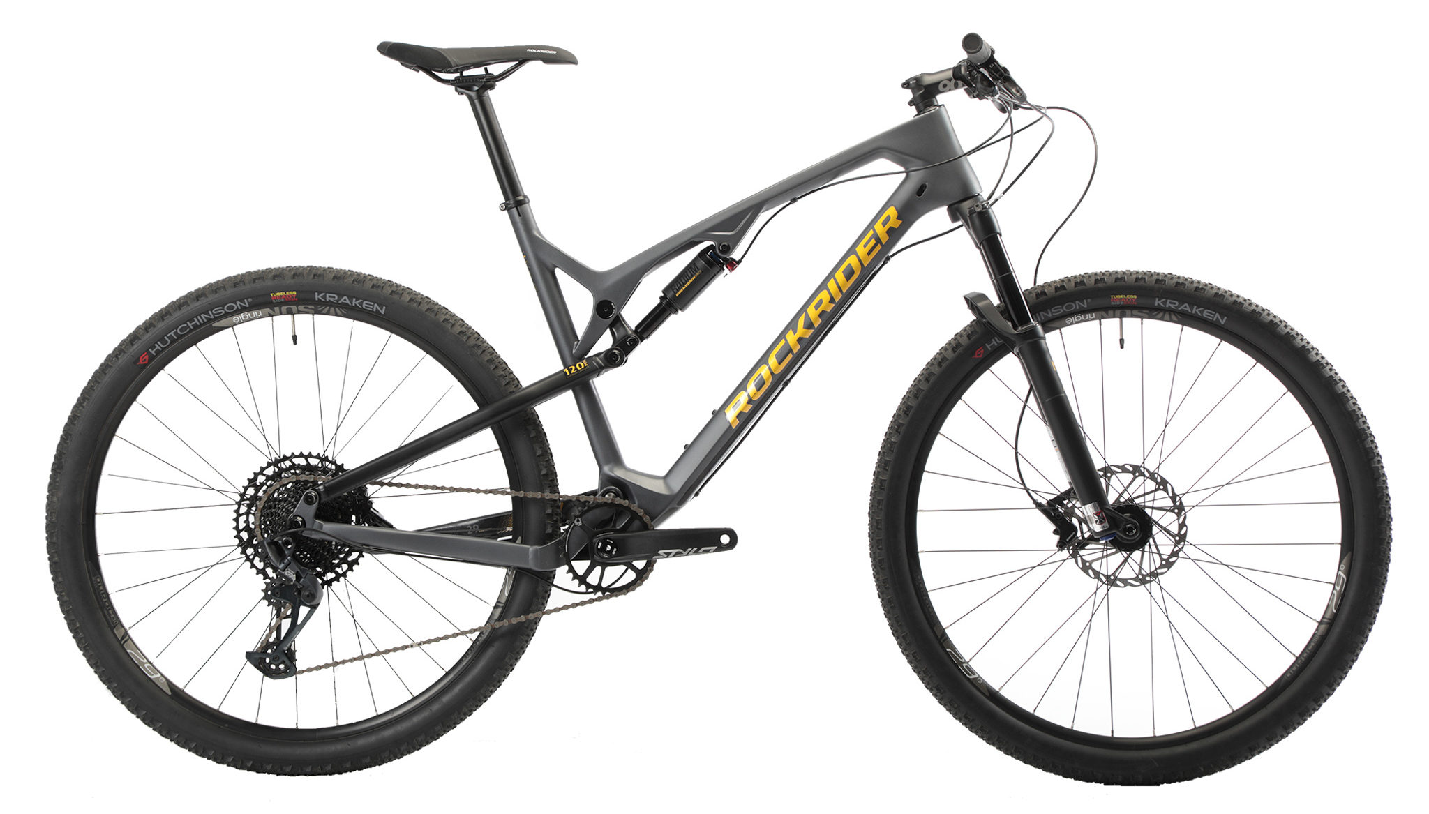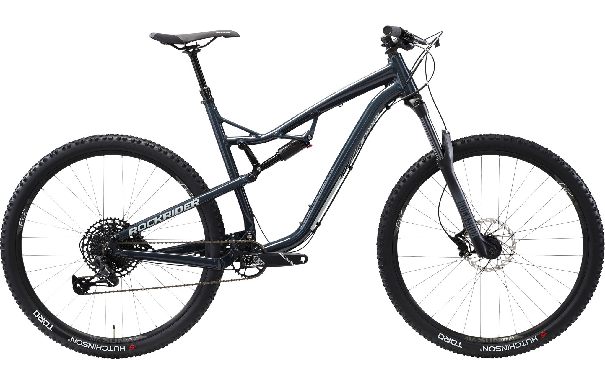 Côté équipements et suspensions, on retrouve une fourche Manitou Machette à l’avant et un amortisseur Manitou Radium, le même que sur le XC 900S. Les deux sont commandés par la manette au guidon Combolock 2 propre à Rockrider. La transmission est un mélange de Sram GX Eagle (shifter, dérailleur) et NX Eagle (cassette, chaîne) et les freins des Sram Level T. Notons que la marque a fait le choix d’un plateau de 34 dents pour affirmer le caractère sportif de son vélo, mais il sera possible de demander un 32 dents en magasin si le 34 dents ne vous convient pas.