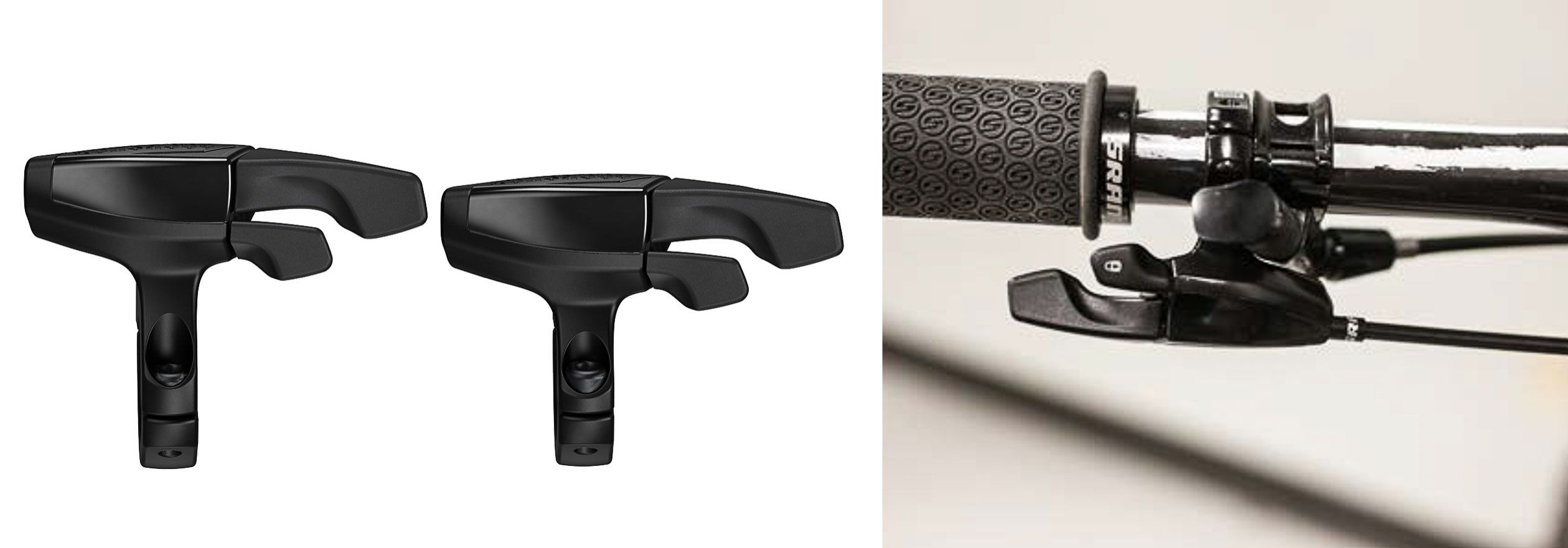 Le OneLoc reprend un design proche de celui d’une commande de vitesses mais, contrairement à ce que son nom et son design pourraient laisser penser, il n’est pas destiné uniquement à prendre la place de la commande gauche de vitesses sur une transmission mono-plateau. Il peut en effet se monter aussi bien à gauche qu’à droite, en dessous comme au-dessus du cintre. Il est également compatible avec une commande de tige de selle Reverb (comme on le voit ci-dessus) et même les GripShift. Sram promet une manipulation hyper douce grâce à un bras de levier important.