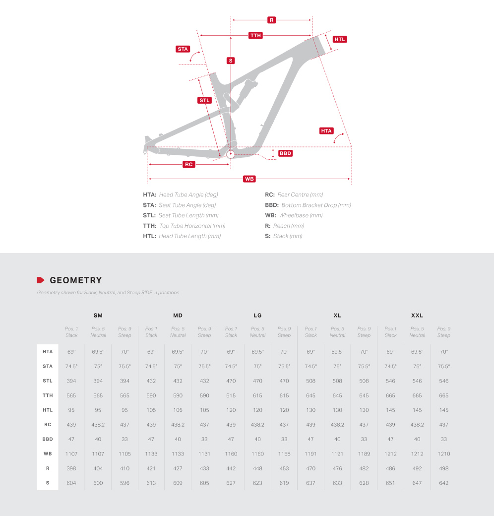 Ces 9 positions influent tant sur l’angle de la fourche (de 69 à 70°) que sur la hauteur du boîtier de pédalier ou encore, dans une moindre mesure, le reach et la longueur des bases, ainsi que sur le comportement de la suspension.