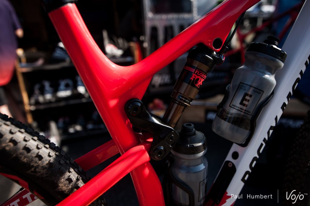 Le Rocky Mountain Element 2017 ne sera proposé qu’en roues de 29″ et il profite du passage au standard Boost au niveau de l’axe de roue arrière pour avoir des bases plus courtes, qui passent de 445mm sur la version précédente à des valeurs comprises entre 437 et 439mm selon la position choisie sur le système Ride-9. Il accepte des pneus jusque 2.35″ de section. Notez aussi le nouveau système de roulements très discret au niveau du pivot situé près de l’axe de roue arrière. La patte de disque est désormais en Postmount.