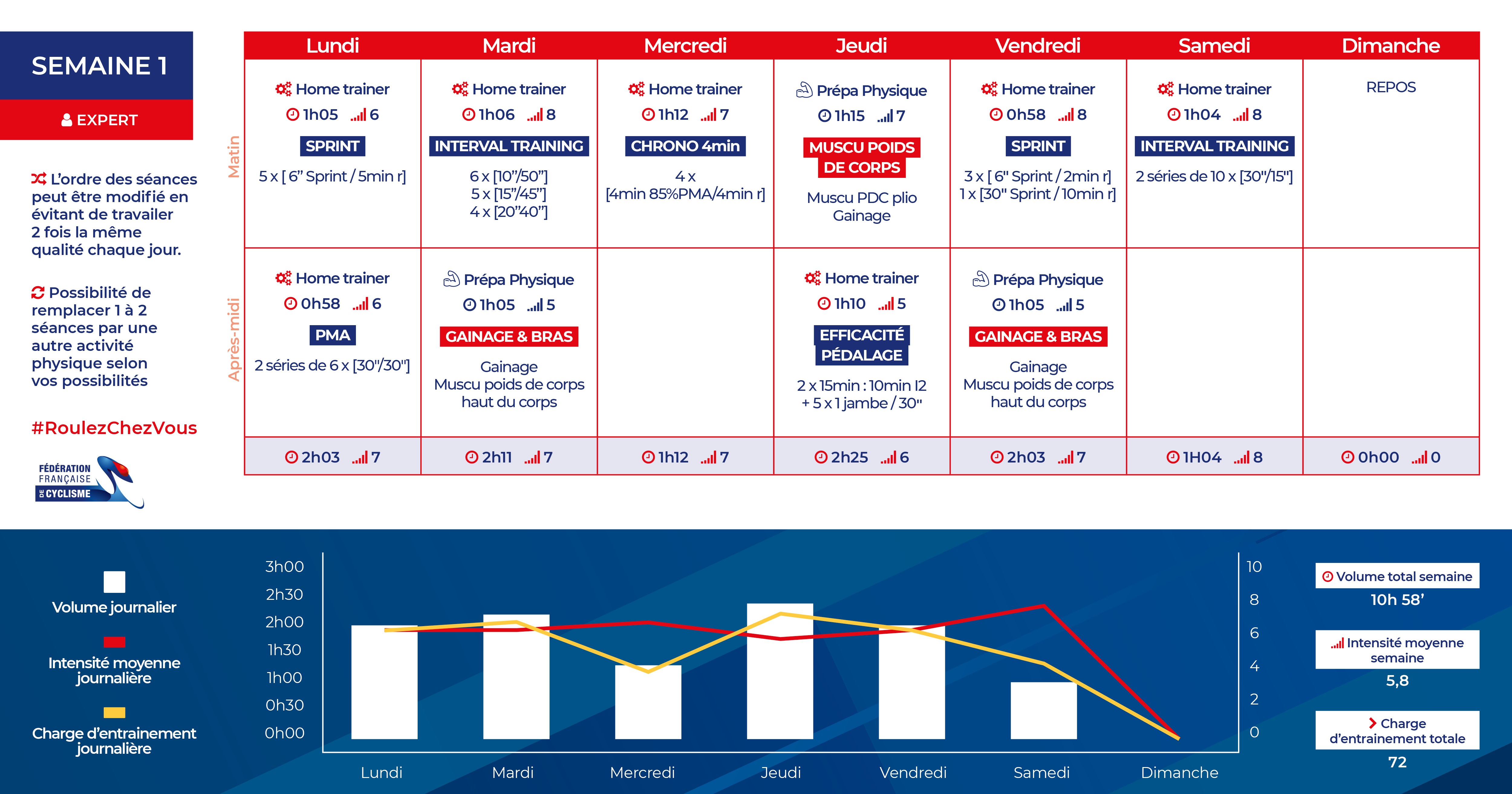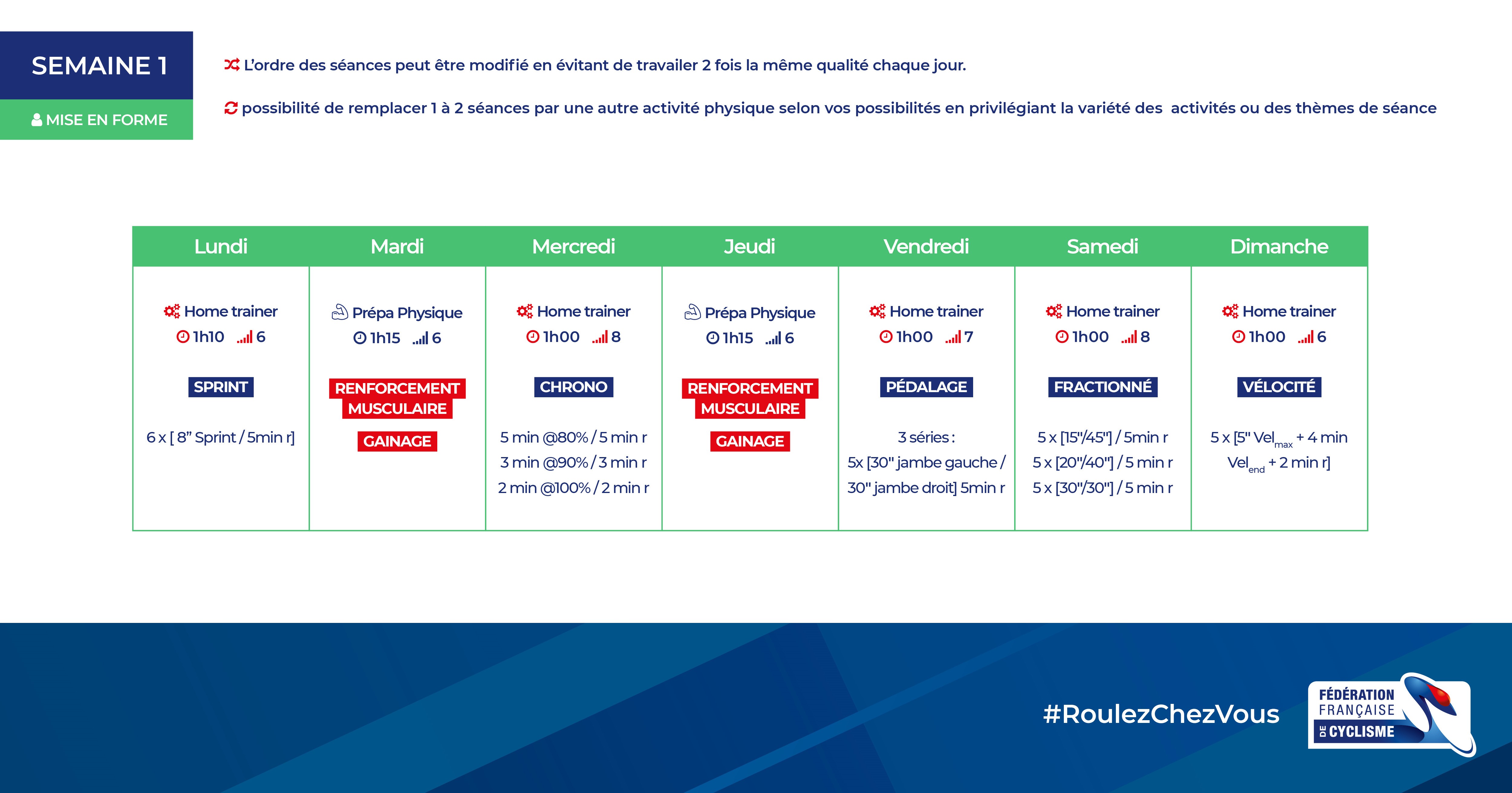 A raison d’une à deux séances par jour suivant le niveau choisi, la FFC espère proposer à tous les cyclistes un niveau d’activité suffisant pour « aider chaque cycliste ou amateur de cyclisme à passer au mieux cette période de confinement » et faire en sorte que la reprise ne soit pas trop difficile.