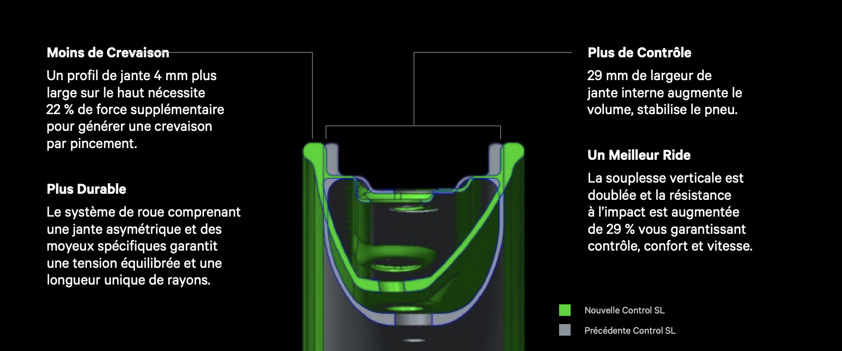 La forme globale de la nouvelle jante des Roval Control SL est aussi modifiée, avec un profil plus bas afin de permettre une meilleure déformation et plus d’absorption des chocs en vertical, sans compromettre la rigidité latérale, synonyme de précision. Malgré leur taille, ces jantes ne pèsent que 358g l’unité.
