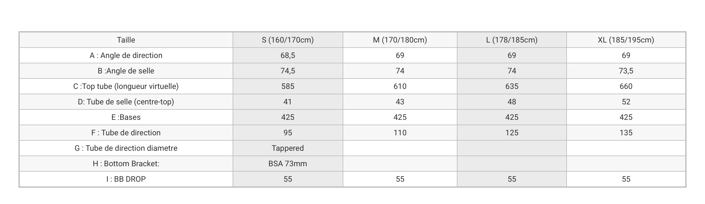 Au niveau de cette géométrie, le LaForêt affiche des cotes assez classiques, avec un angle de direction de 69°, un angle de selle de 74°, des bases de 425 mm et un top tube de 610 mm en taille M.