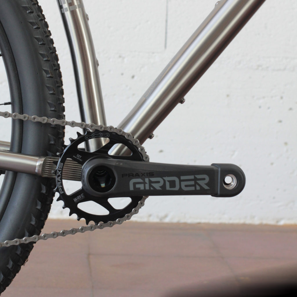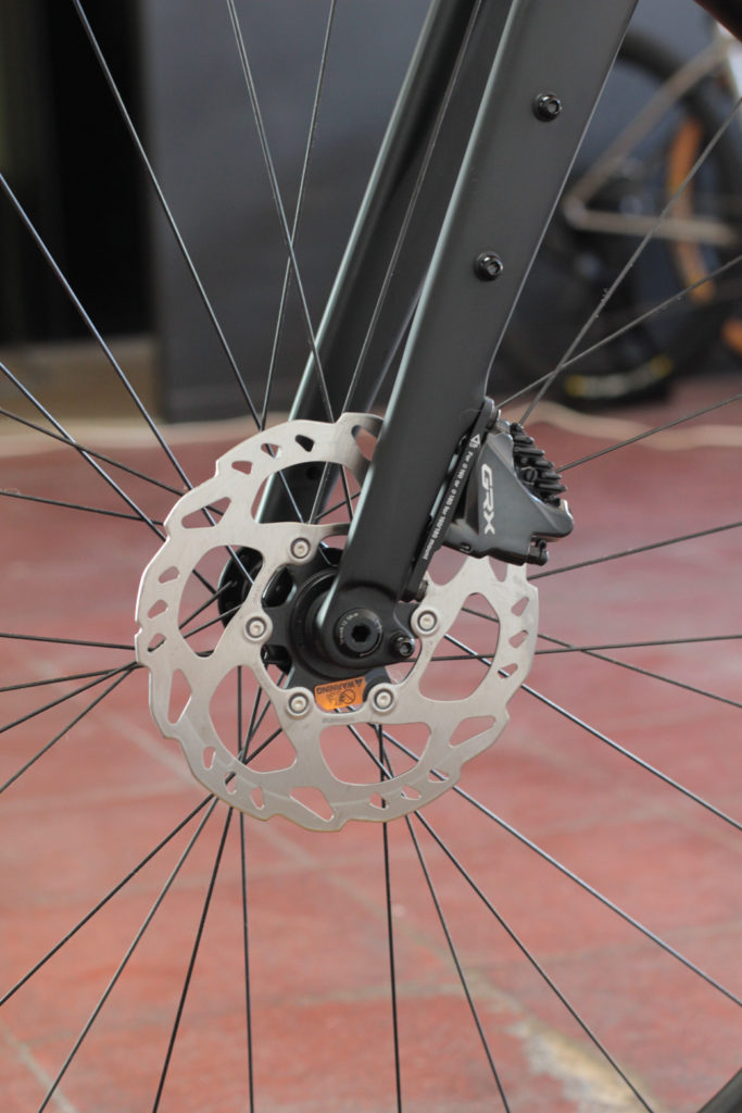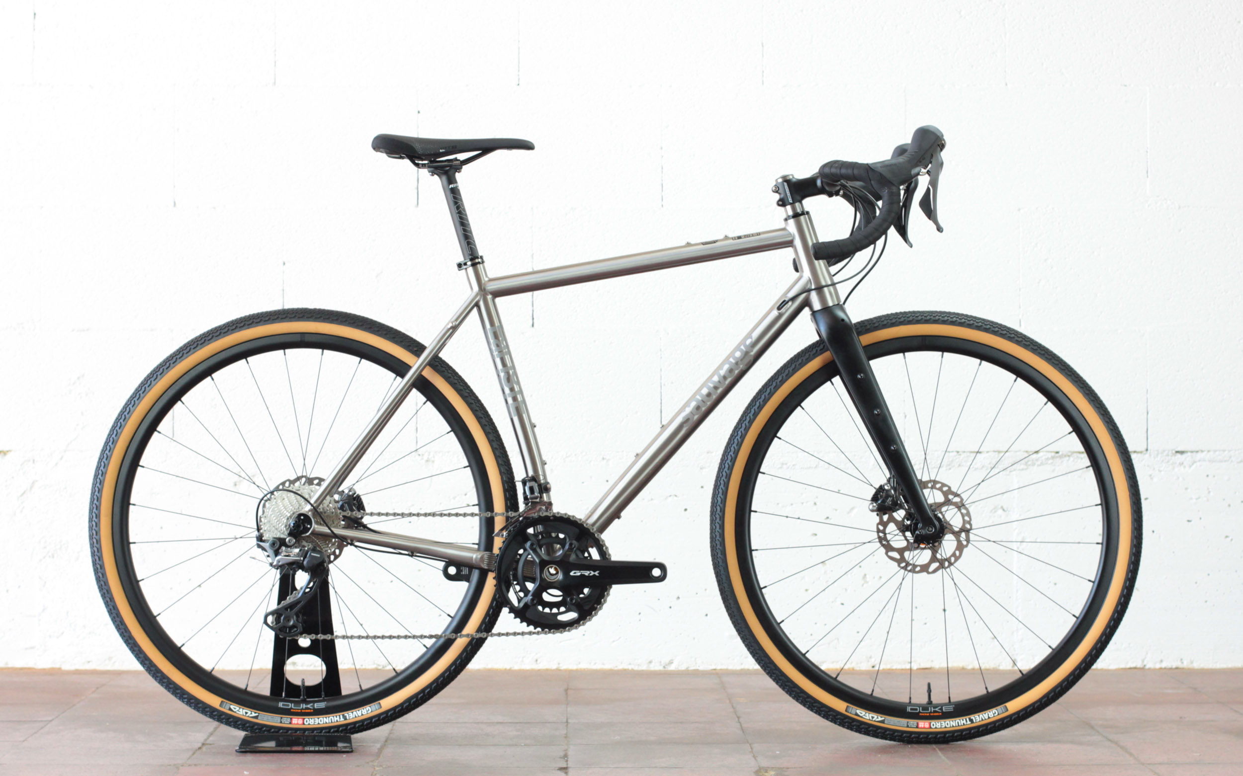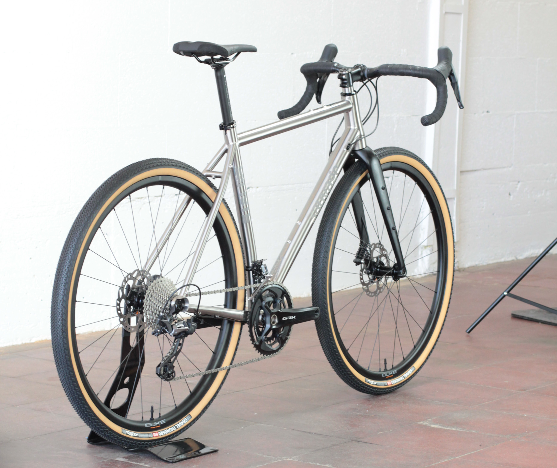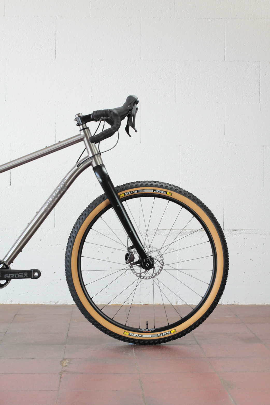 L’influence du VTT se ressent résolument dans le choix de la transmission monoplateau (Shimano GRX 800 en 11 vitesses), ainsi que dans le train roulant avec une paire de Duke Lucky Star en 29″ pouvant accueillir des pneus jusqu’à 2.35.