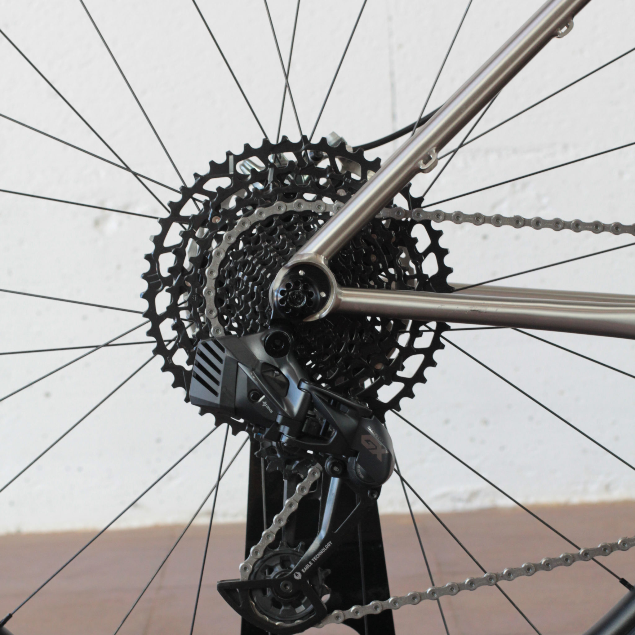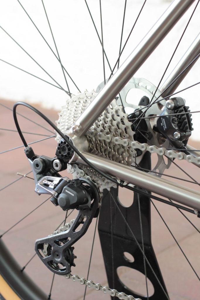 Si la fiche technique peut sembler similaire à celle du LaPiste, des différences existent pourtant : notamment au niveau des roues artisanales, à base de jantes en aluminium Duke Lucky star, de moyeux Bitex et de rayons Sapim, ainsi que de la transmission puisque c’est ici Shimano et son groupe GRX 800 en monoplateau et 11 vitesses qui a été choisi par Sauvage.