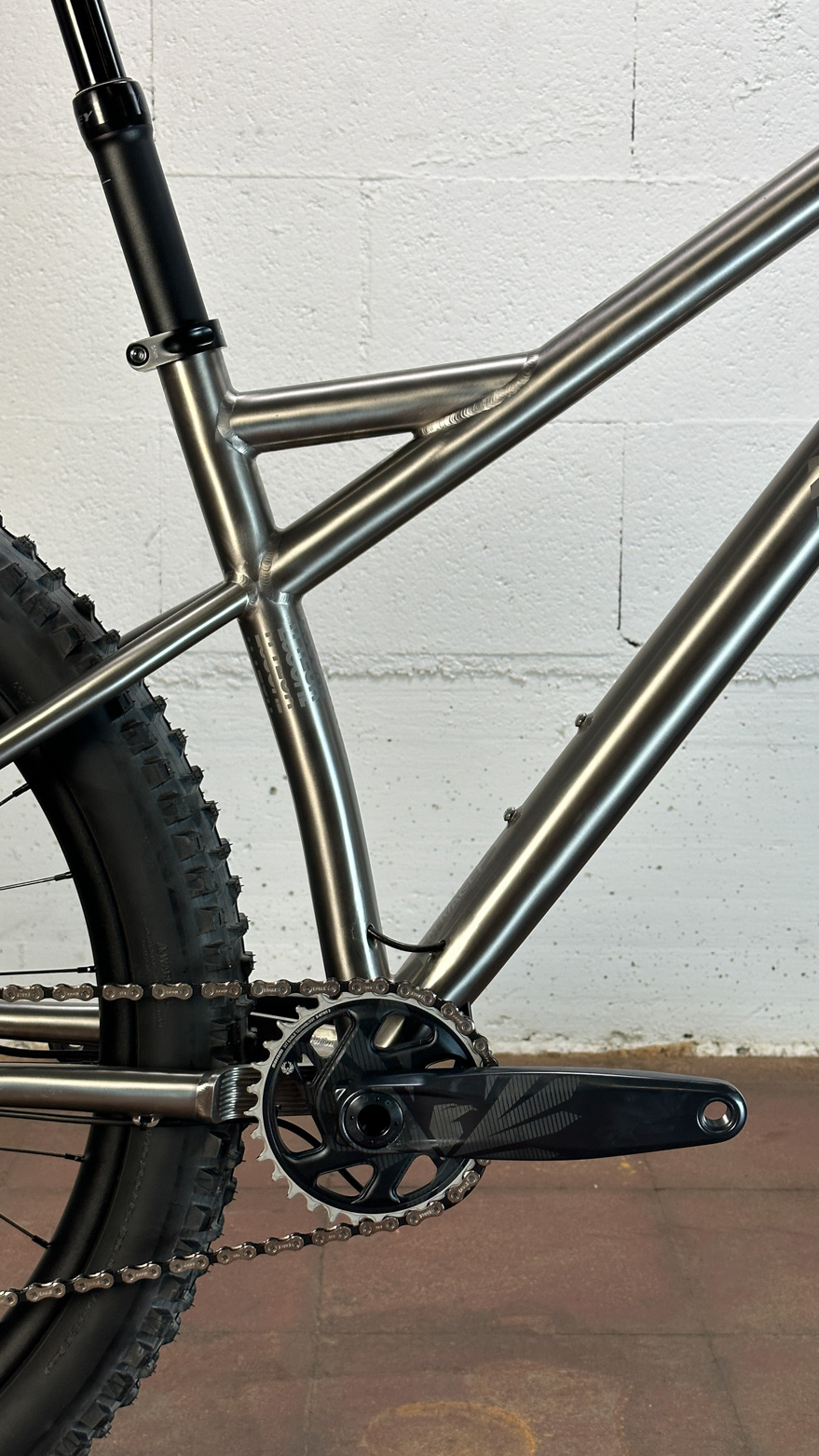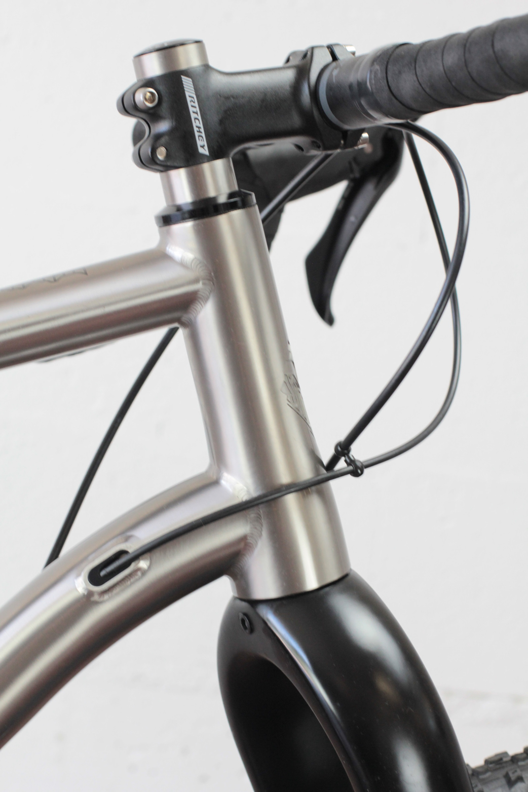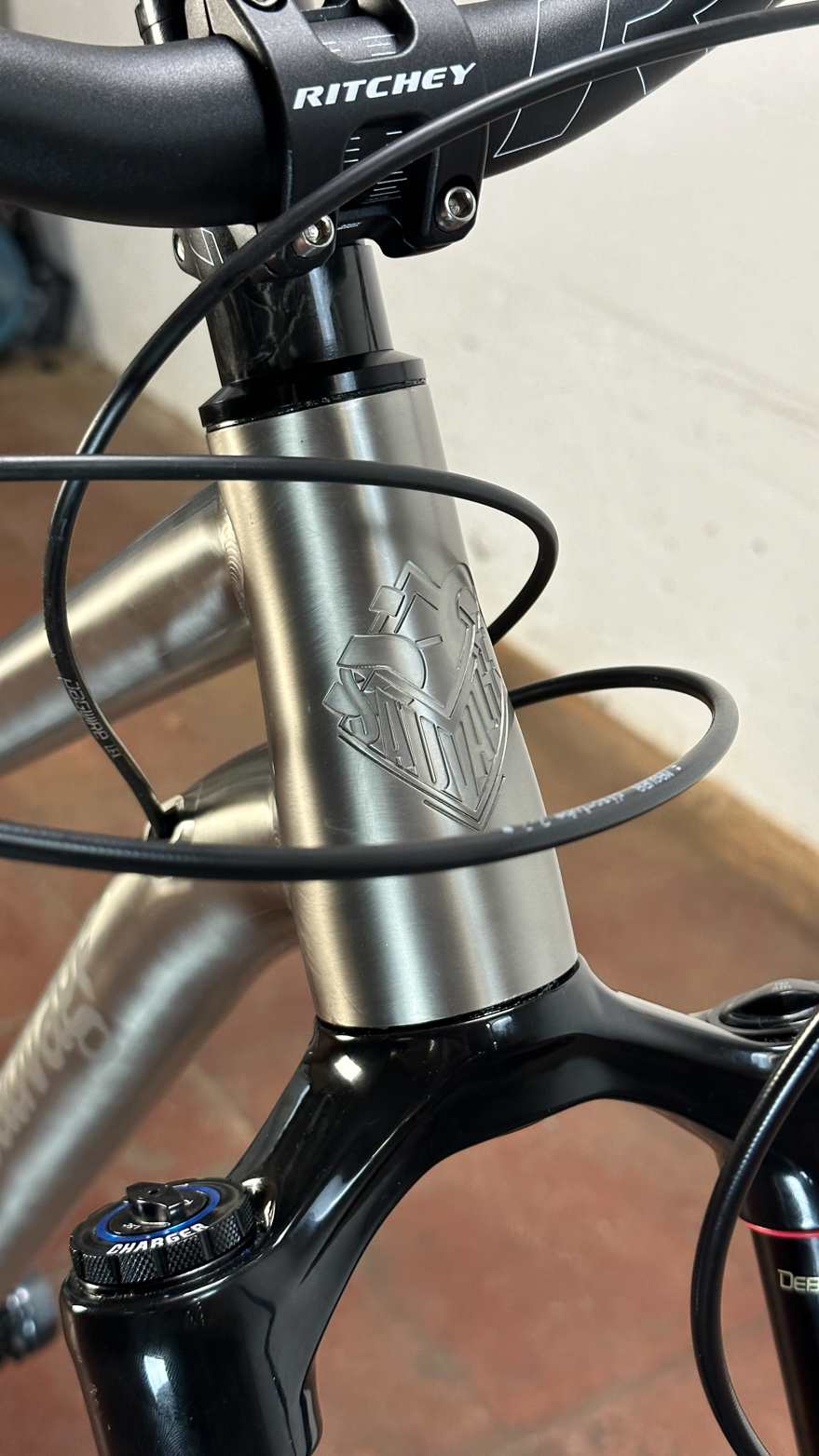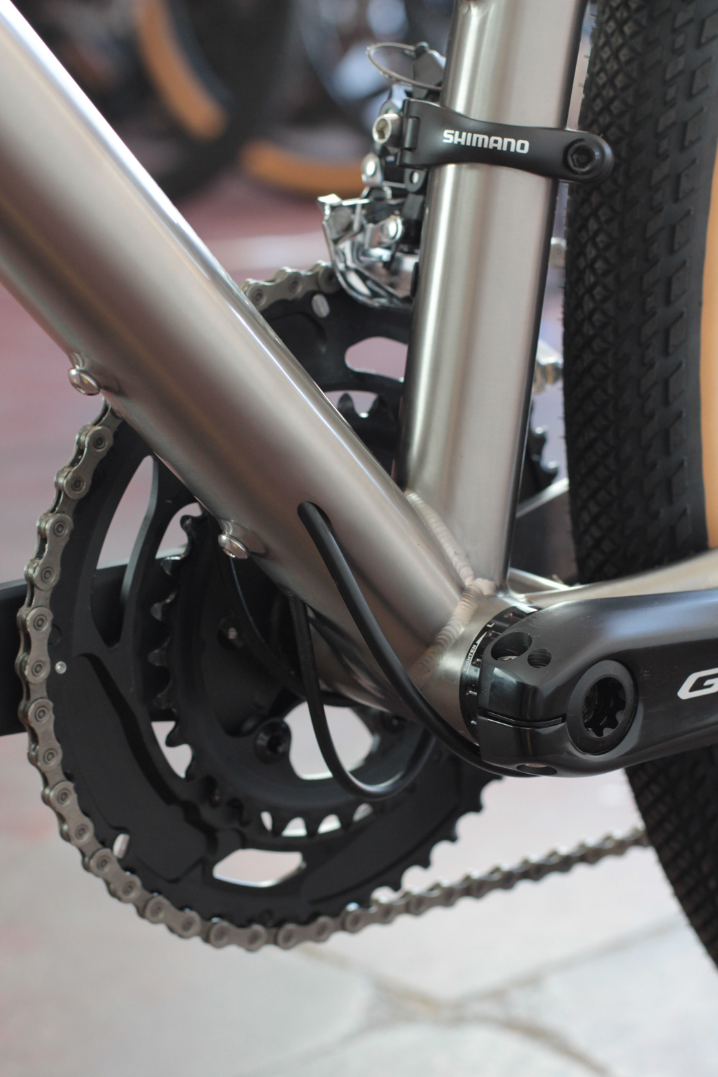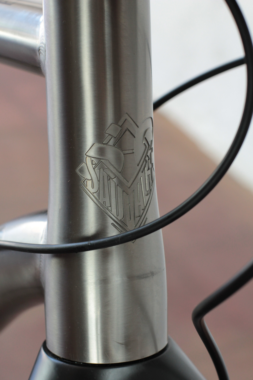 Au-delà des soudures particulièrement jolies de ce cadre en titane, une attention particulière a été portée aux détails et finitions. Sauvage explique que ceux-ci sont directement gravés au sein du cadre. Si une tige de selle fixe en 31.6 mm est prévue sur ce LaPiste, la marque française explique que pour les utilisations plus radicales, un passage interne pour une tige de selle télescopique peut également être demandé par le client.