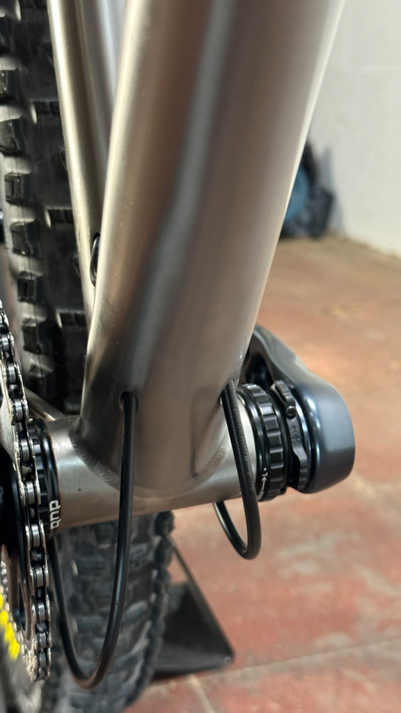 Le cadre dispose d’un passage interne des gaines, d’un emplacement pour un porte-bidon et d’une tige de selle télescopique Bikeyoke Revive en 125 mm de débattement.