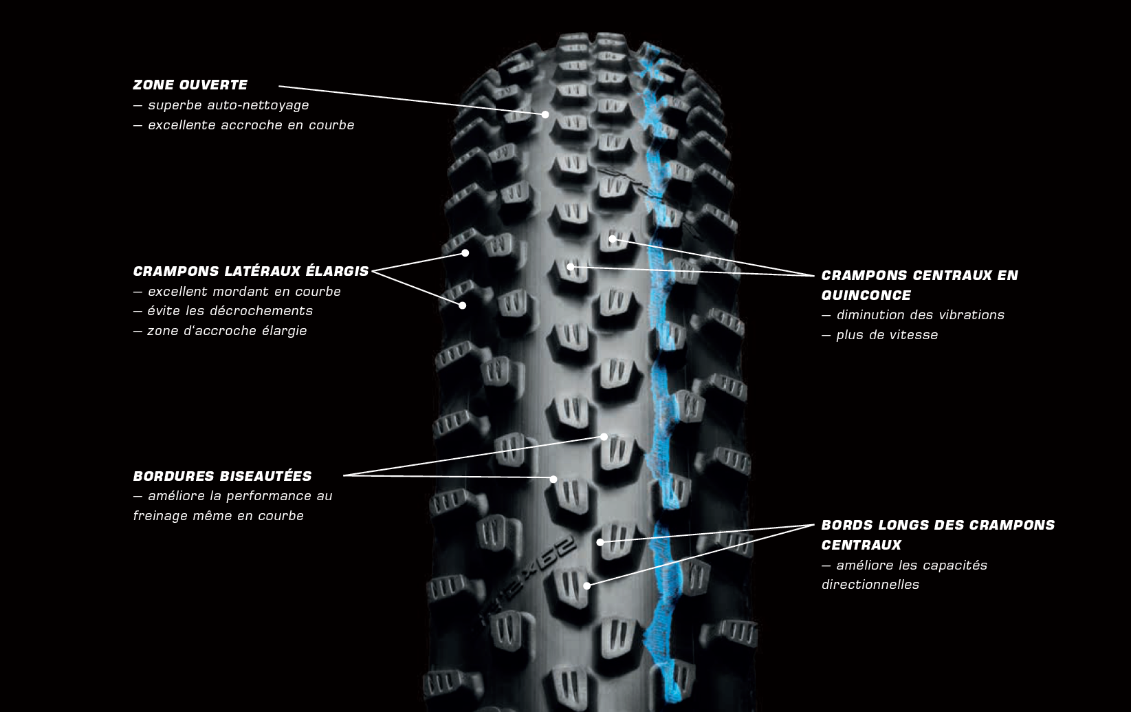On le voit aussi au niveau des crampons sur l’image ci-dessus : ils sont nombreux et rapprochés sur la bande centrale pour former une bande de roulement, puis plus imposants sur les bords pour le grip en virage. Le Racing Ray ne sera disponible qu’en gomme Addix Speedgrip, soit la gomme XC la plus souple de la gamme, afin aussi de jouer au maximum la carte du grip, tout en conservant une résistance au roulement raisonnable.