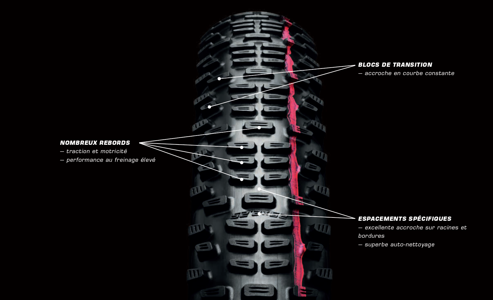 Le nouveau Schwalbe Racing Ralph, dédié à l’arrière, mise tout sur la traction et la résistance au roulement la plus faible possible. Les crampons sont donc orientés tout à fait différemment, avec une surface frontale maximale et un petit côté latéral. Schwalbe promet une traction optimale sur sol sec, mais aussi sur des surfaces humides et glissantes, comme les racines et autres pierres si fréquentes sur les parcours de coupe du Monde… mais aussi dans la « vraie vie » et sur les tracés que nous empruntons tous !