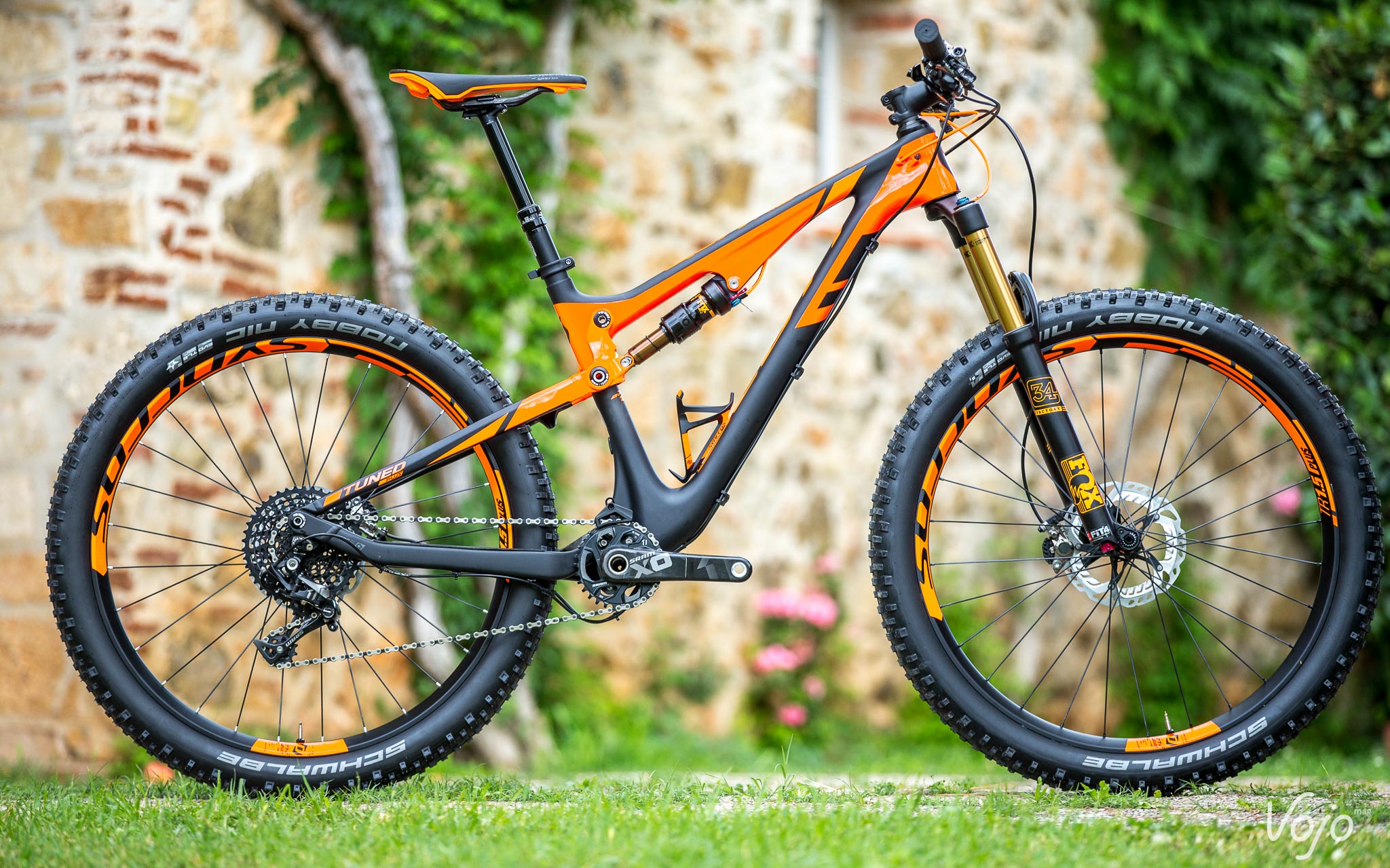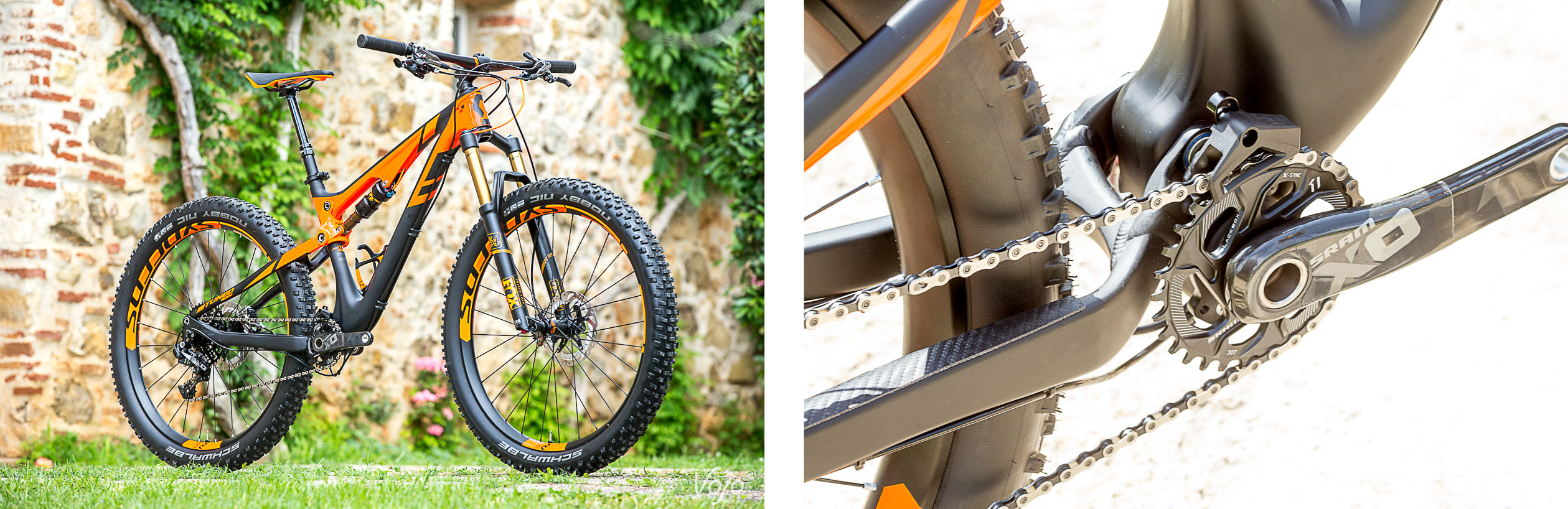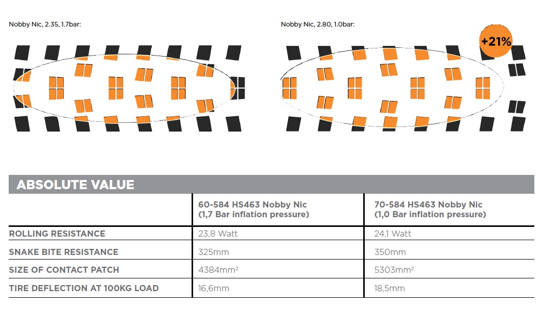 Le schéma ci-dessus montre, à gauche, l’empreinte d’un Schwalbe Nobby Nic 27,5×2.35 » gonflé à 1,7 bar et à droite, le même pneu en 2.8 » avec 1 bar de pression. On y voit qu’il y a 21% d’augmentation de la surface de contact au sol. Mais comme celle-ci se fait majoritairement sur la largeur du pneu, et moins en longueur, la résistance au roulement n’augmente que de 1% comme on peut le lire dans le tableau. Plus étonnant mais très intéressant : grâce à la combinaison avec une jante large, on note aussi une augmentation de la résistance aux crevaisons par pincement (+8%) alors que le Nobby Nic 2.8 » est doté de flancs assez fins pour lui permettre de garder un poids réduit (850g) et qu’il n’est gonflé qu’à 1 bar. Passons maintenant aux vélos :