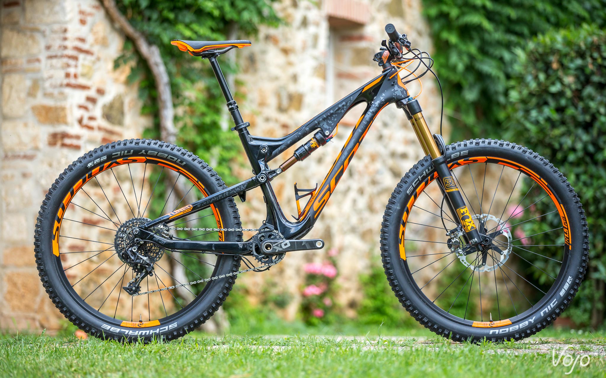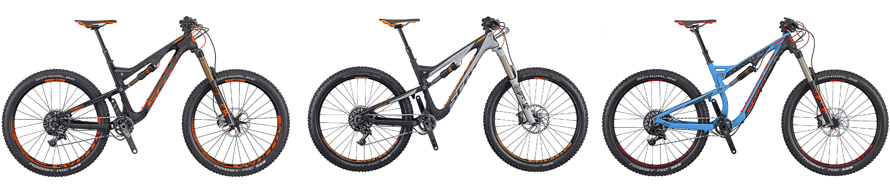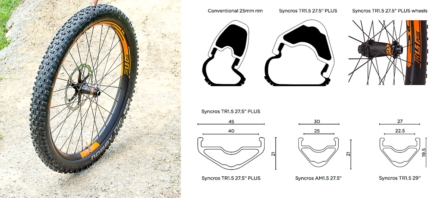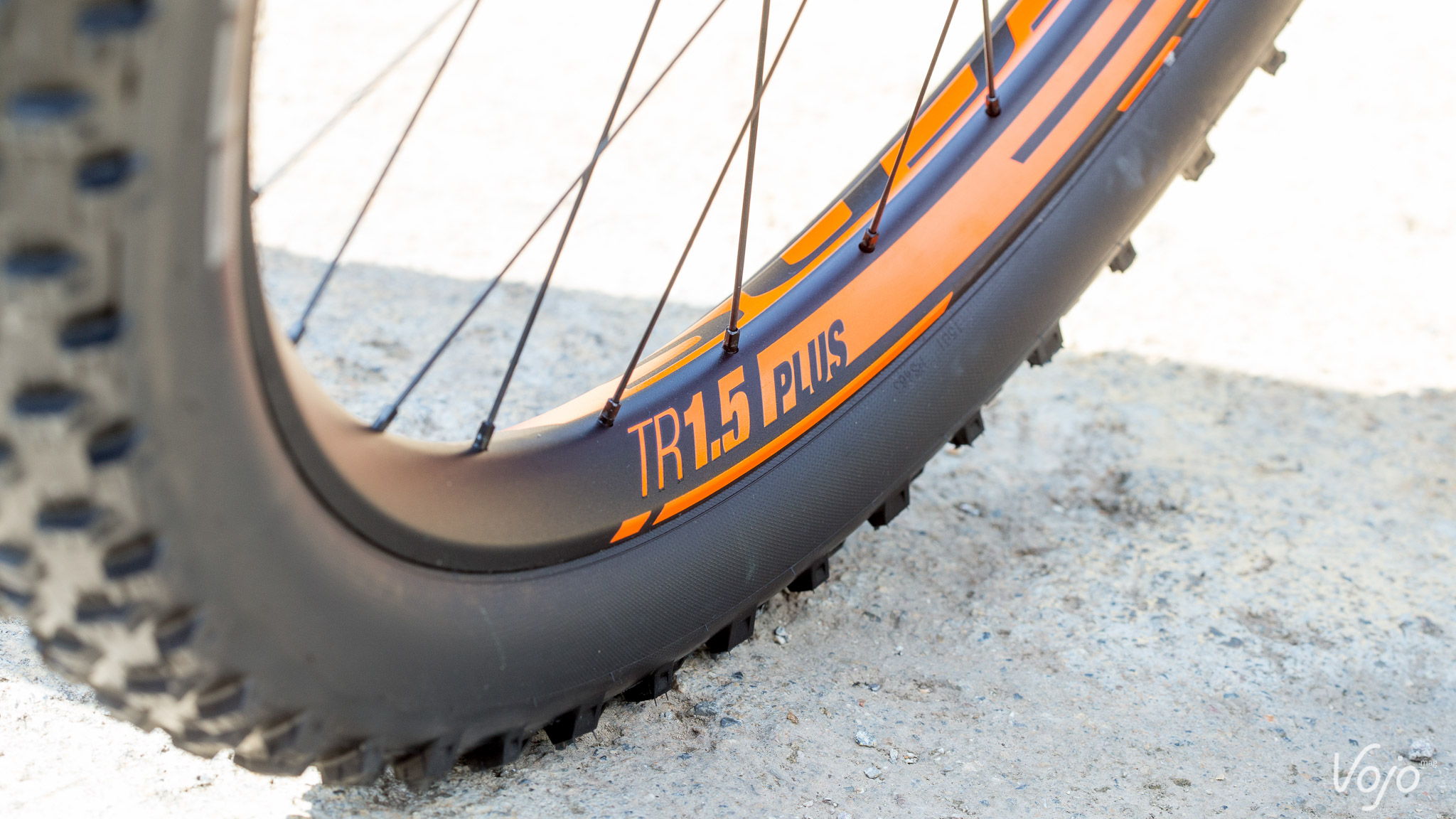 Pour développer sa gamme Plus, Scott a d’abord travaillé sur de nouvelles roues, sous le label de sa marque d’équipements Syncros. Le nouveau cercle TR 27,5 » offre une largeur de 40mm, parfaite pour accueillir des pneus de section 2.8 ou 3.0 ». Après de nombreux tests, Scott a fait le choix de spécifier des gommes de 2.8 » de section car, selon les pilotes maison, ils permettent de mieux préserver la maniabilité. Malgré tout, le 2.8 » permet aussi de rouler à faible pression et d’obtenir les avantages propres au Plus en termes de confort, d’accroche et de capacité à survoler les obstacles mais, combiné à une jante de 40mm, Scott vante un meilleur comportement dans les appuis. On constate ici que Scott prend un chemin différent de Specialized, qui préfère monter des pneus de 3.0 » sur une jante de 30mm de large.
