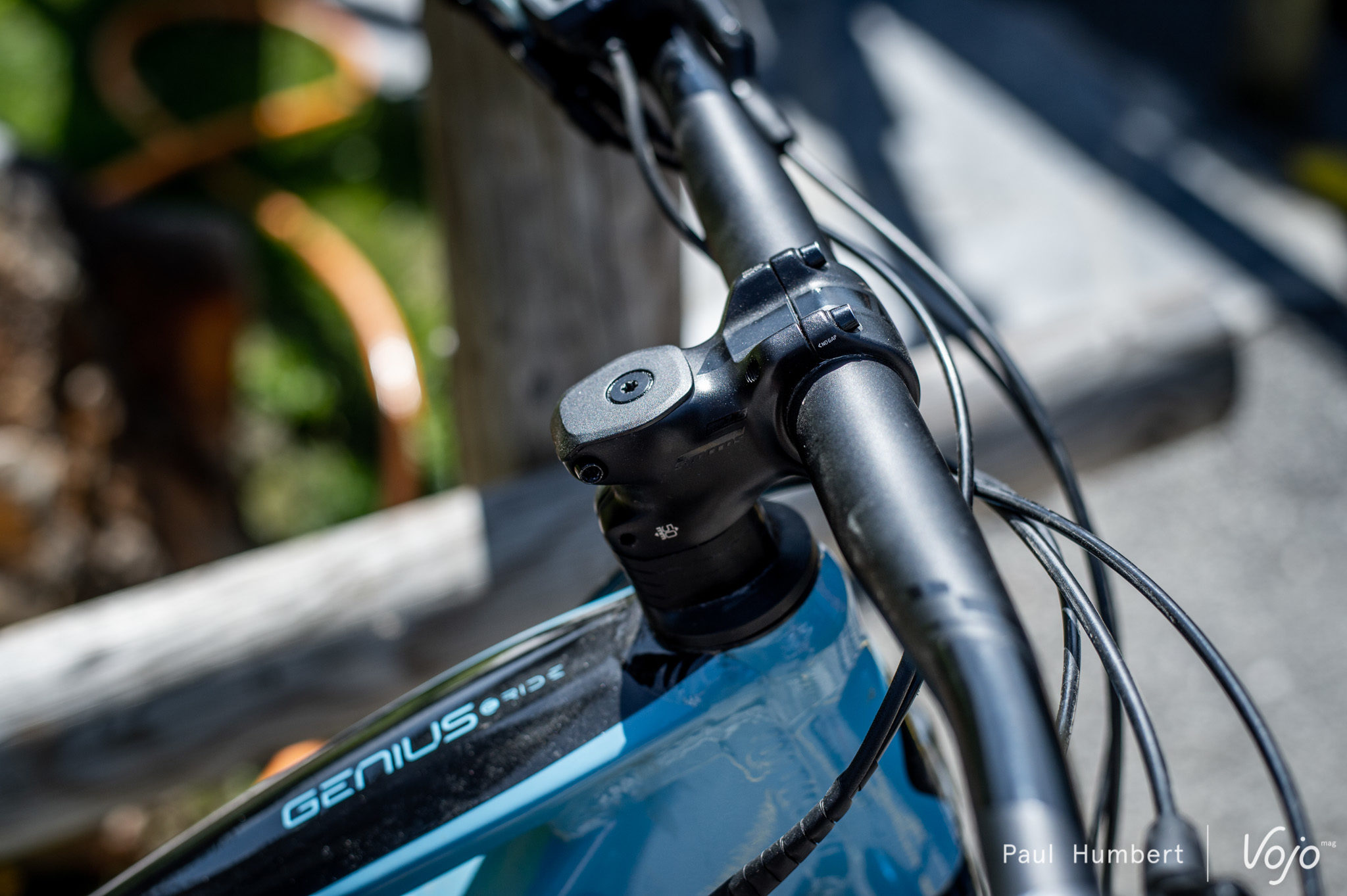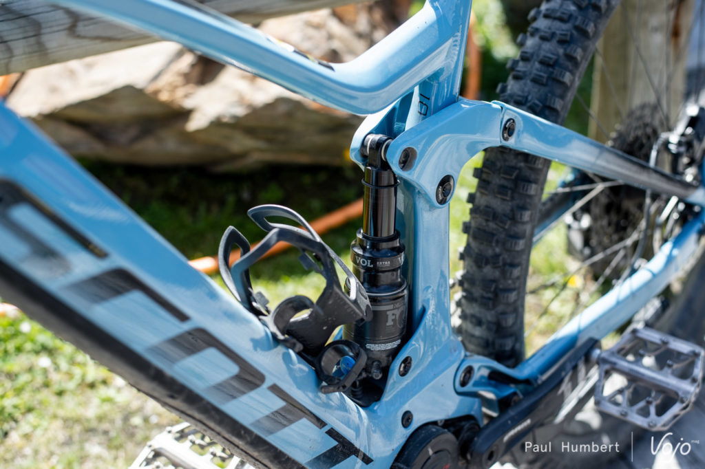 Identique au cadre du Strike E-Ride, le Genius E-Ride est retravaillé avec un top tube plus large au niveau de la colonne de direction. On imagine qu’il passe sur un débattement supérieur de 150mm et on remarque des choix de composants plus en phase avec le vélo : des pneus plus sérieusement cramponnés (et non des Maxxis Rekon très light comme sur le Strike) et une fourche Fox 36 plus apte à accepter les mauvais traitements.