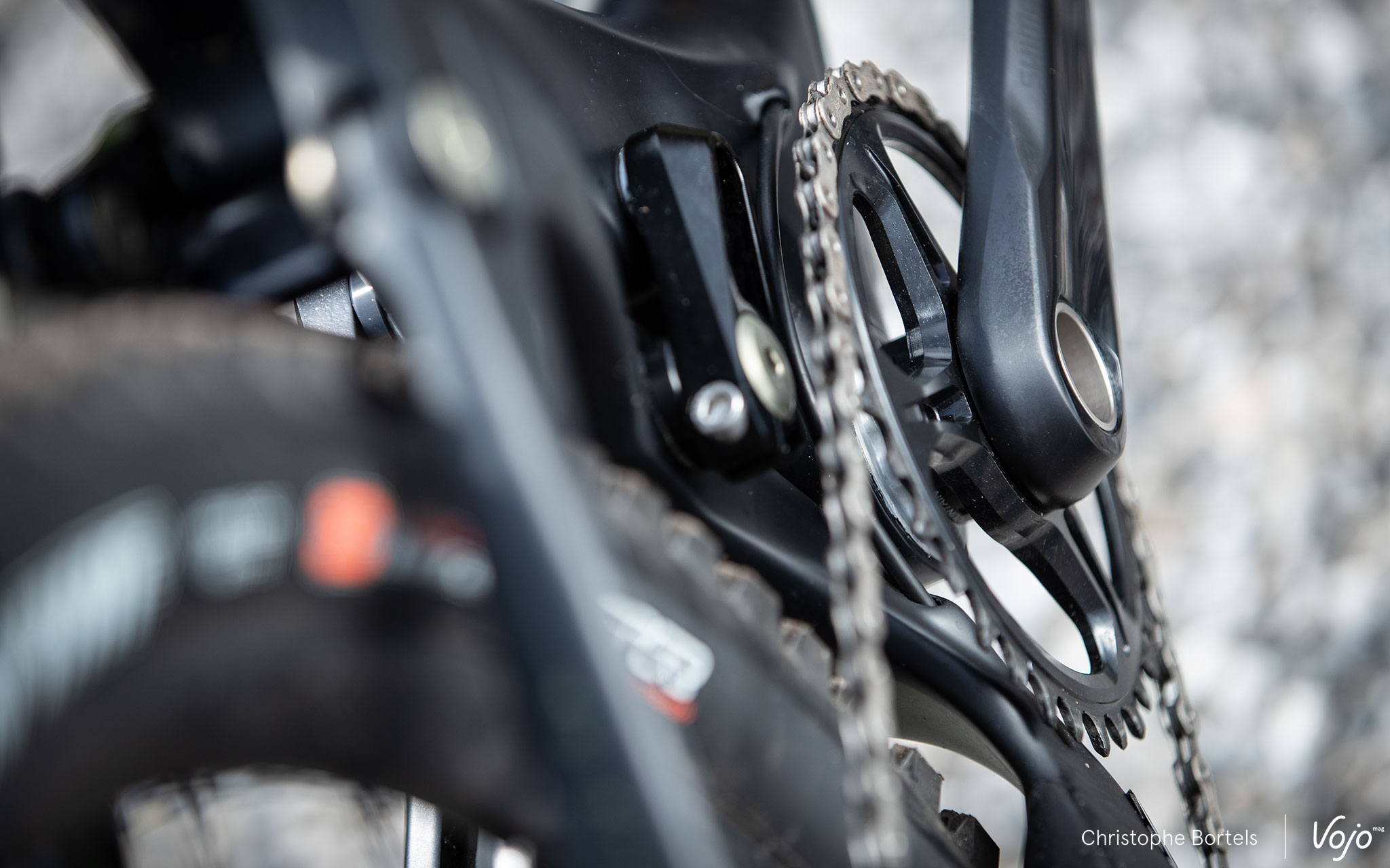 On le constate au premier coup d’oeil, ce qu’on voit sur la photo ci-dessus n’est évidemment pas le « véritable » pédalier du groupe XTR 12 vitesses, mais la solution temporaire, proposée par Shimano – répondant au nom de MT900, une référence hors groupe – en attendant l’arrivée du M9100 (ou M9120 avec Q-Factor plus large, 168 vs 162), le vrai celui-ci. Reprenant des technologies de l’ancien comme du nouveau XTR et pesant 587g (175mm, 32dts, sans boîtier), ce MT900 très sobre a eu le mérite de permettre aux fabricants de finalement pouvoir fournir des vélos complets équipés en XTR 12 à leurs clients. Certaines marques ont facilement pallié ce souci de pédalier indisponible grâce à des solutions maison comme Cannondale et son habituel Hollowgram, mais d’autres ont dû faire le choix d’opter pour des manivelles d’autres marques avec plateau compatible XTR 12 vitesses, voire même dans certains cas de livrer les vélos sans pédalier.
