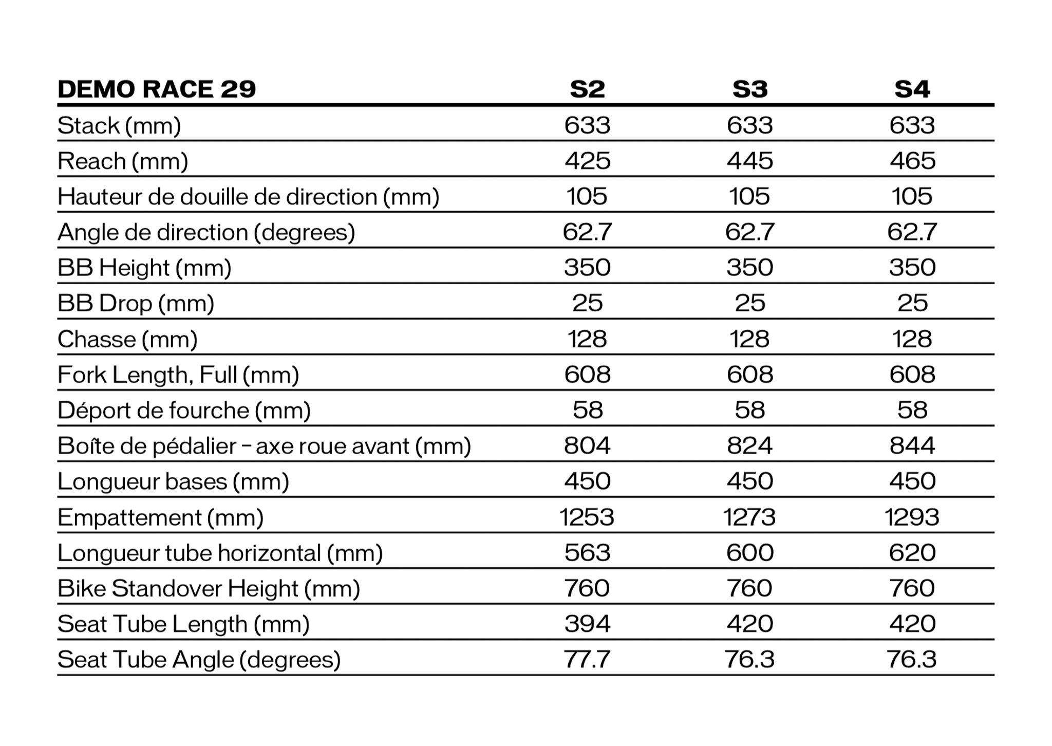 Côté gamme, Specialized commercialise deux modèles complets, le Demo Race 29 noir (6699€) et le Demo Expert 29 bleu (4699€). Un kit cadre turquoise est proposé à 2499€ euros et un « ancien » modèle de Demo 8 27,5 pouces reste en gamme.