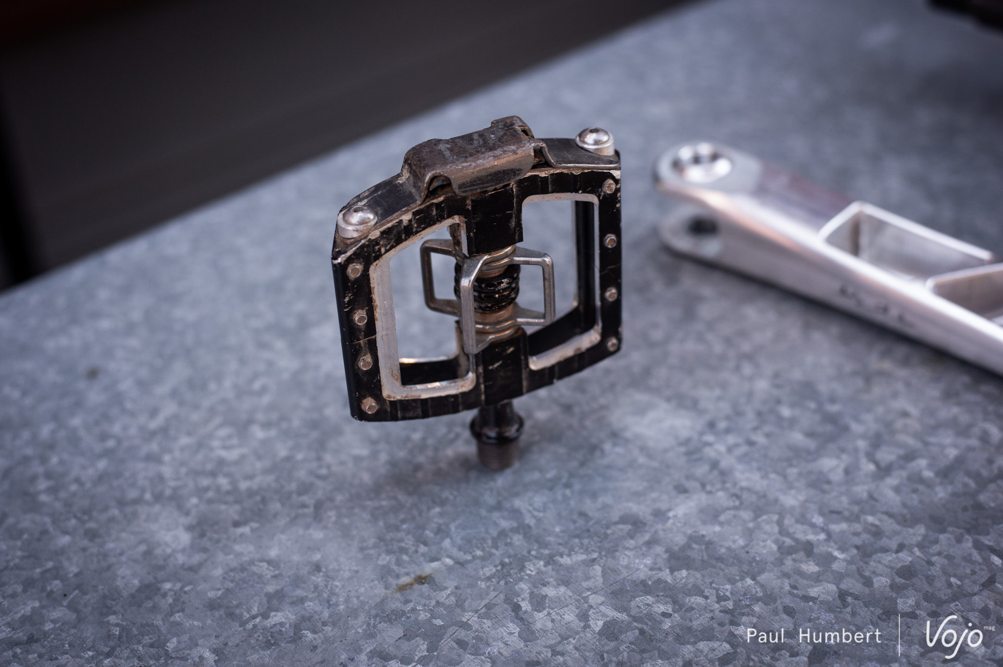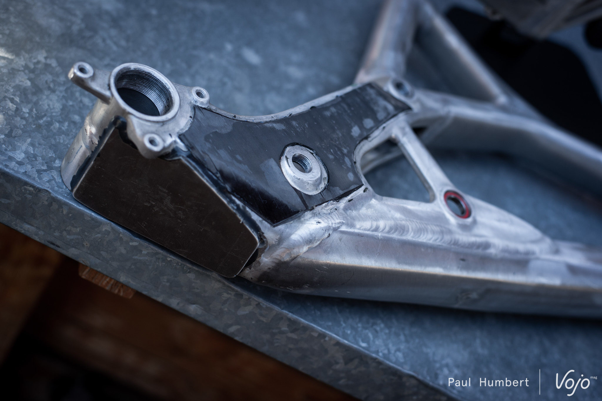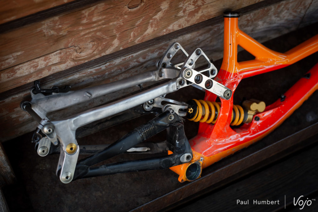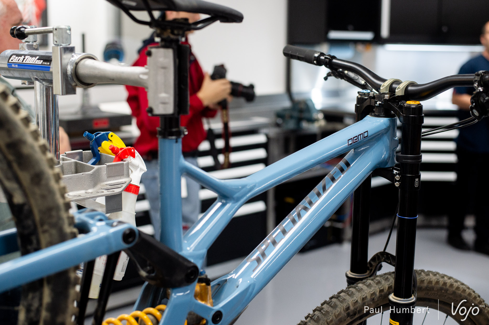 On découvre également des pièces de conception à l’origine de la réflection autour du nouveau Demo 29. Un ancien cadre de Demo 8 pour tester la cinématique, et un cadre sur lesquels des pièces de carbone ont été collées pour déterminer la rigidité nécessaire. Pour mesurer la force des chocs et des impacts, des capteurs sont positionnés sur les pédales du testeur.