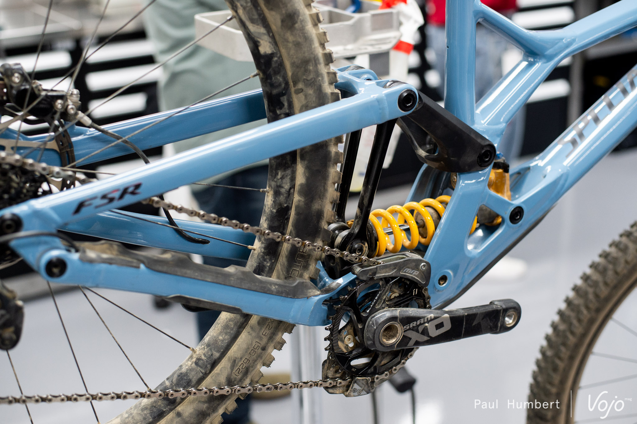 C’est un des éléments-clés de cette nouvelle cinématique. Trouver le point d’équilibre avant d’aller « trop loin » a été bien délicat. Un vélo qui s’allonge excessivement altère la géométrie, la valeur de kickback et peut aboutir à une moins bonne sensibilité sur les petits chocs. Specialized n’a pas choisi non plus d’utiliser un système de roulette (comme sur le Commencal Supreme ou le Norco Aurum) pour conserver son dynamisme et limiter les frictions sur la transmission.