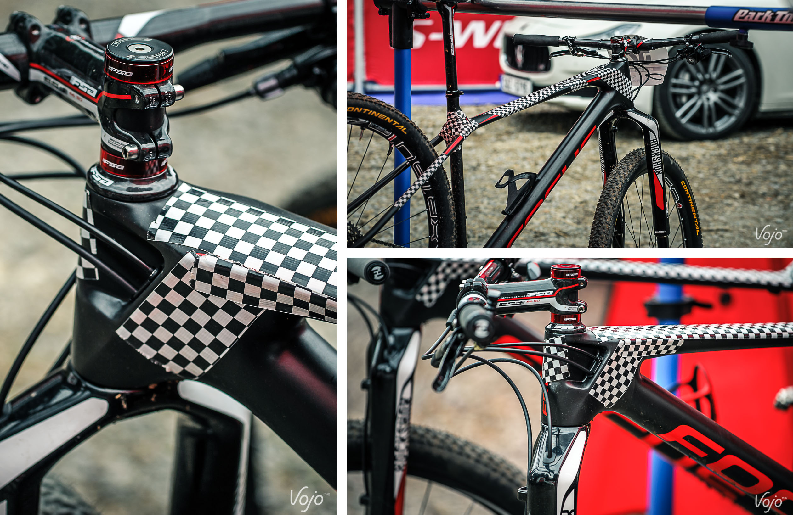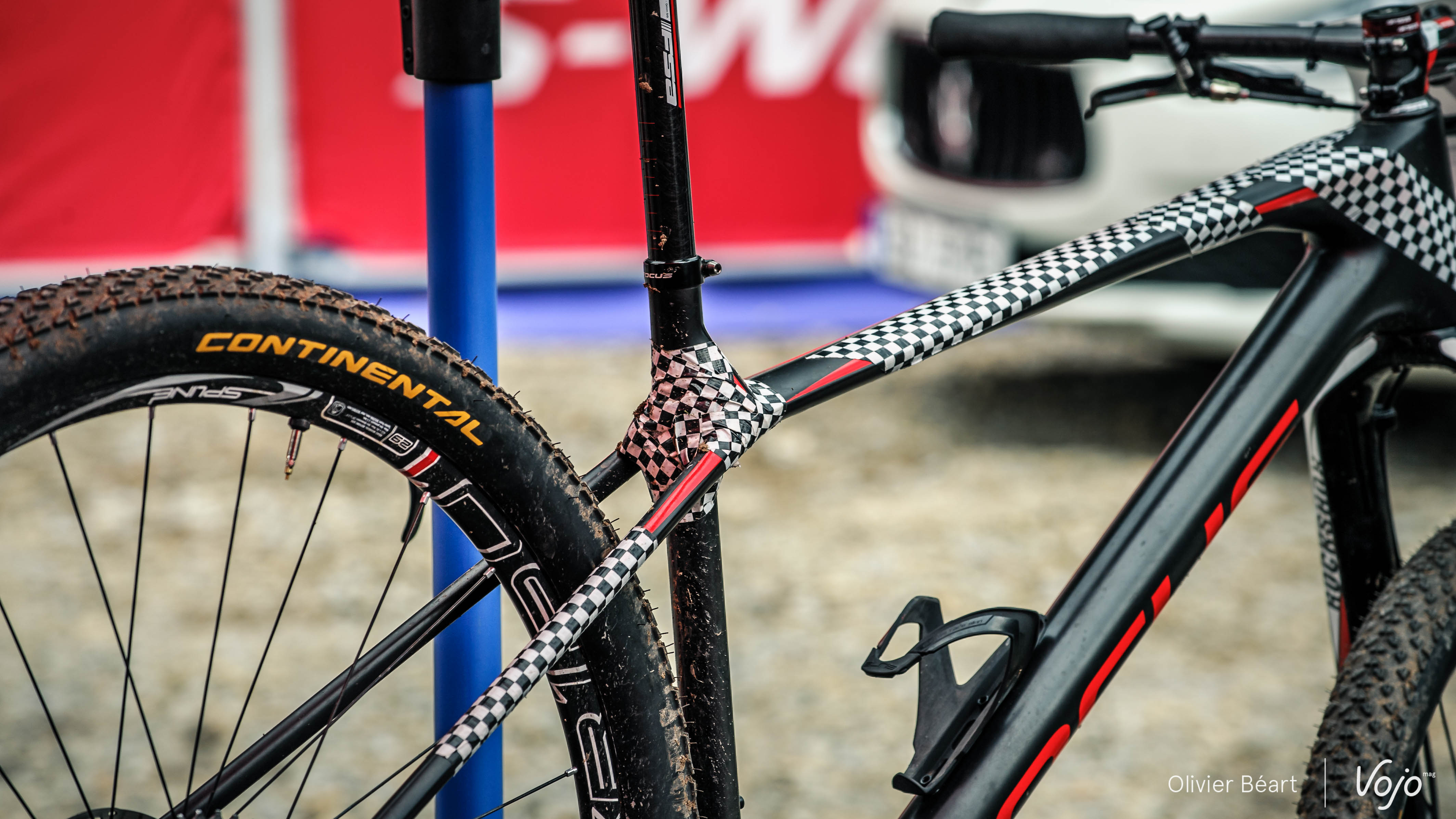 Mais ce qui intrigue le plus, c’est la présence massive de tape de camouflage sur le haut du tube de selle. Ce n’est pas un serrage intégré de la tige de selle, puisqu’on note la présence d’un collier sur le haut.