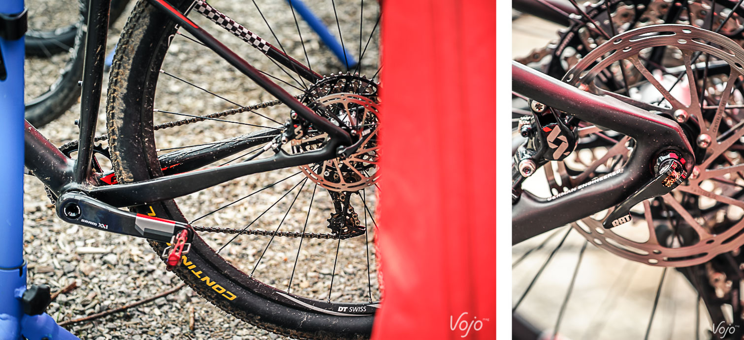 Autre détail intéressant, les pattes arrière sont équipées d’un nouveau système de blocage rapide, développé à l’origine par Focus pour ses fourches de route et cyclocross pour freins à disques. Son maniement est ultra-rapide et permet de bénéficier des avantages d’un axe traversant, sans les inconvénients. Tous les vélos que nous avons vus étaient en 29 », mais une déclinaison 27,5 » est probable car Focus a jusqu’ici toujours proposé plusieurs formats de roues.