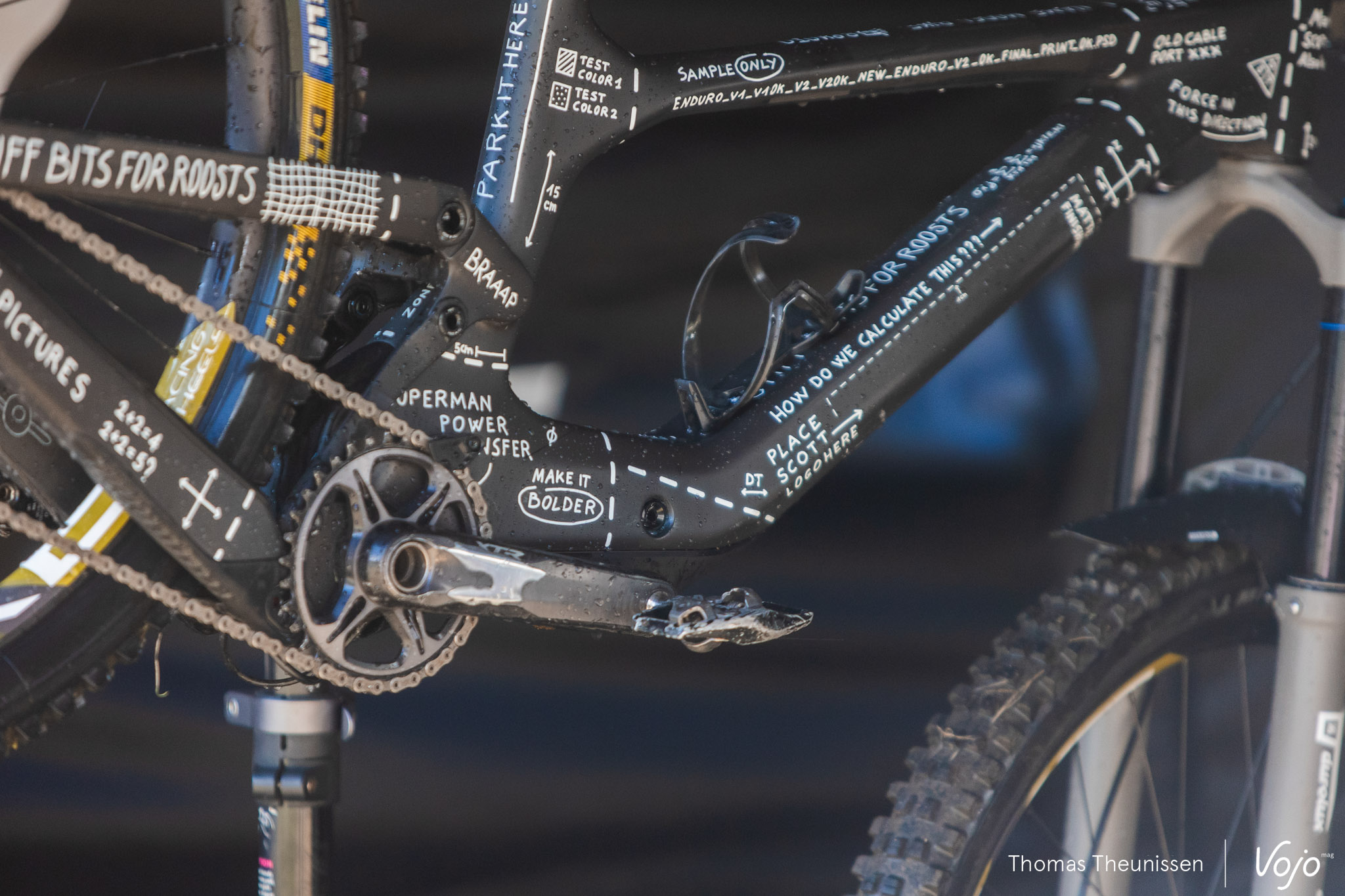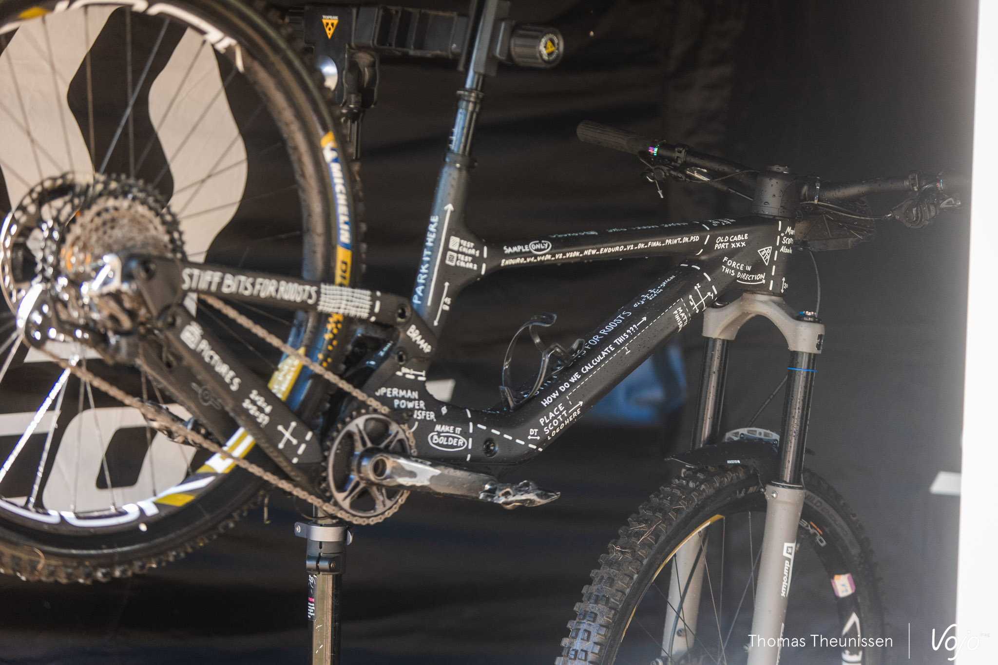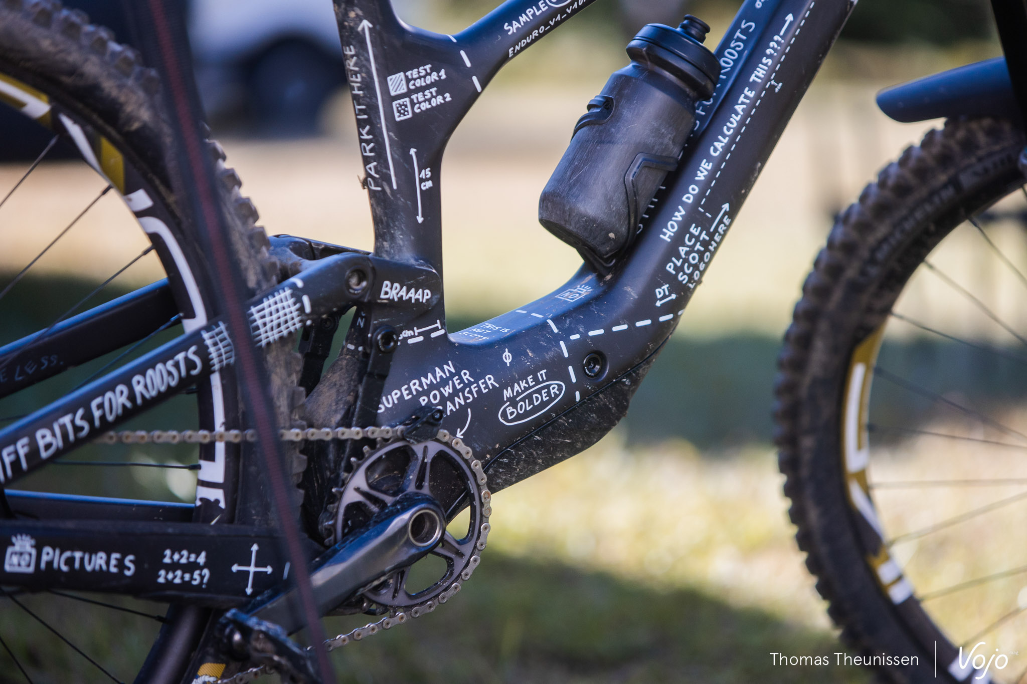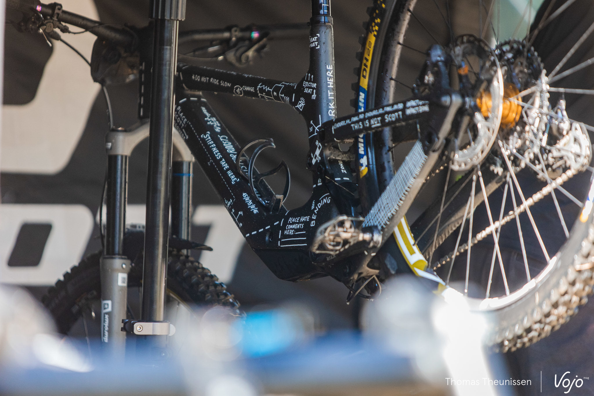 Enfin, on remarque l’habituel jeu de direction Acros/Syncros avec ces imposantes entretoises en plastique et les gaines qui rentrent dans le cadre en se faufilant le long de la potence. Le cadre est en carbone, matériau dans lequel Scott excelle même si la marque a récemment réussi de très belles choses en aluminium (sur le Genius notamment). Contrairement au Trek Slash d’Harriet Harnden, on ne voit ici aucun composant prototype ou inconnu du public, l’équipement semble correspondre à ce que l’équipe utilise habituellement.