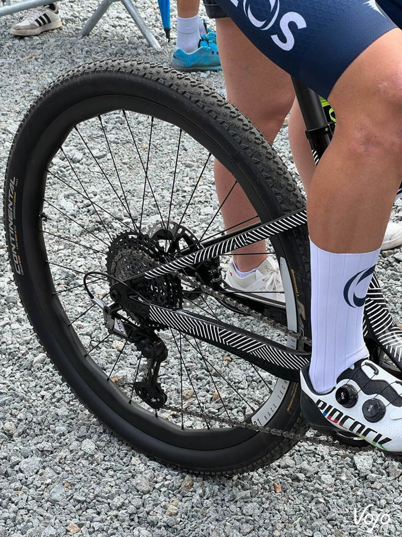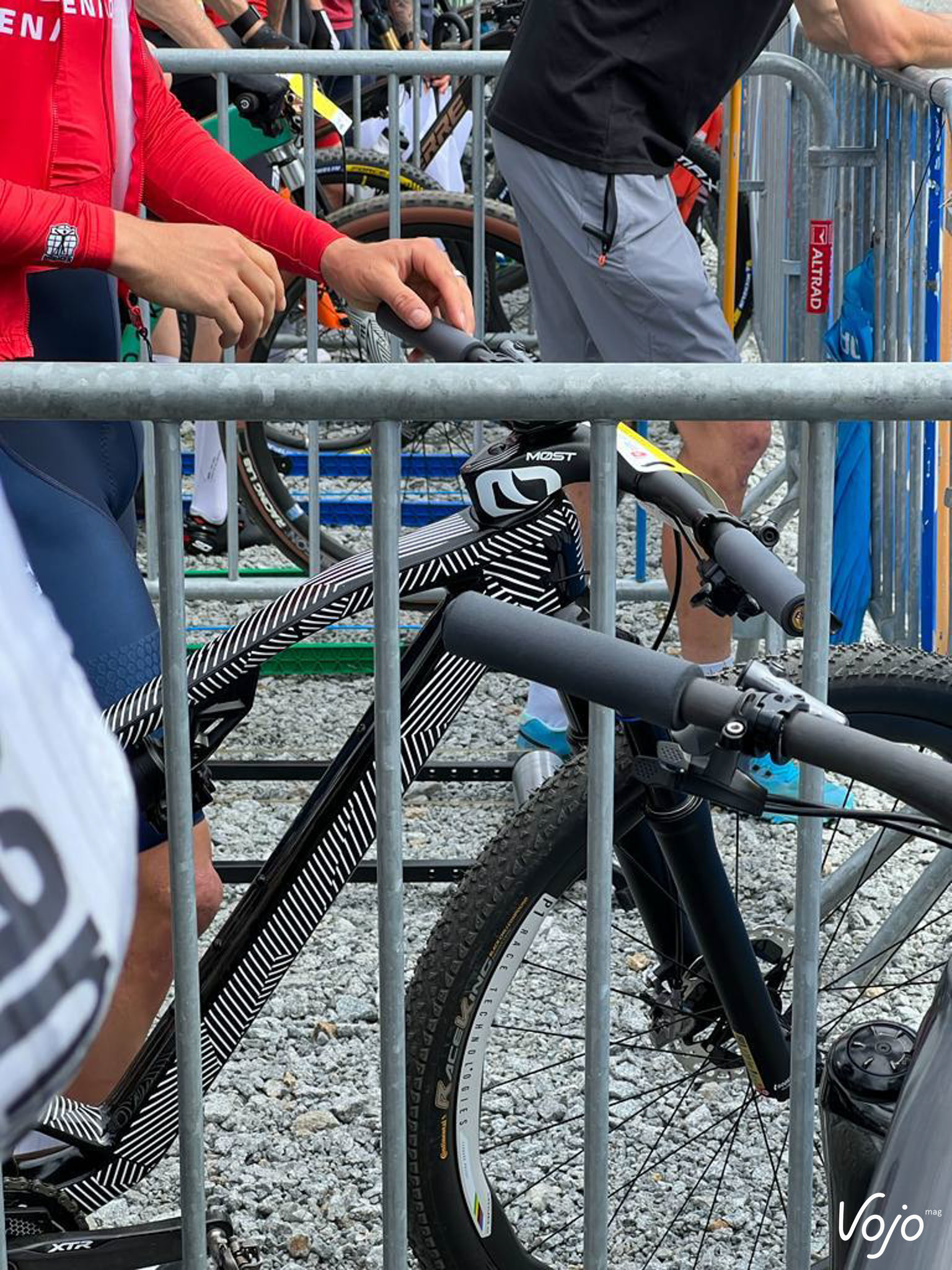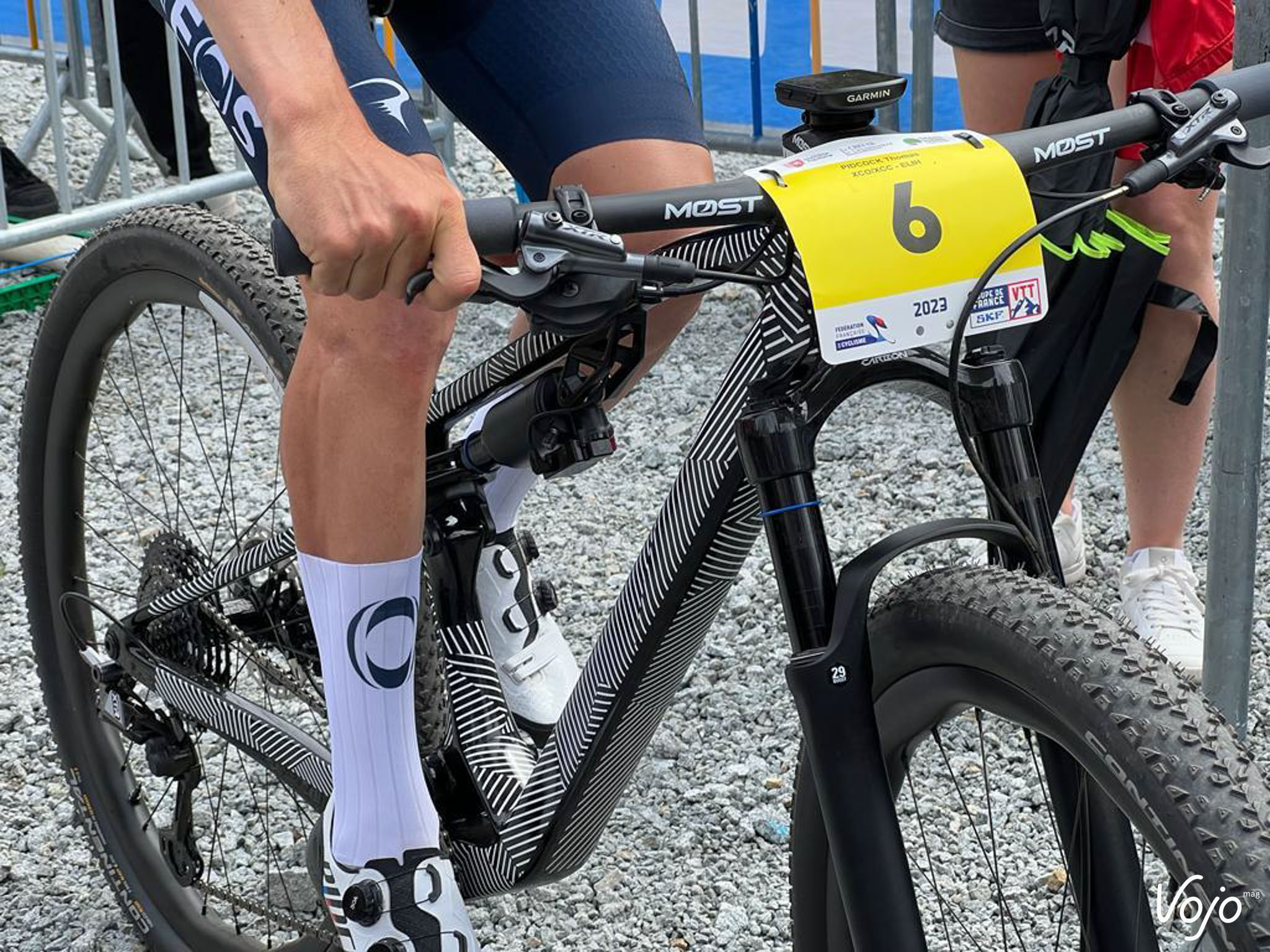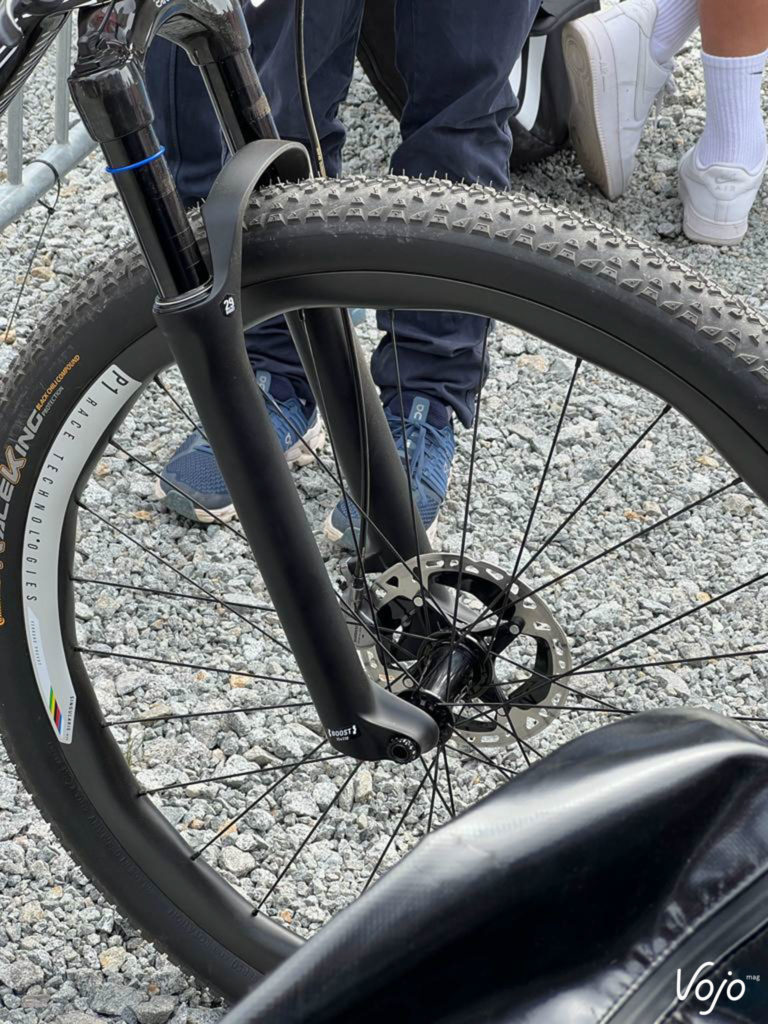 Les suspensions, justement, sont sans l’ombre d’un doute l’œuvre de SR Suntour. On reconnaît d’ailleurs le système de gestion électronique et « automatisé » (pas d’intervention possible du pilote en course) déjà aperçu sur le vélo de Tom Pidcock l’année dernière, aux Gets notamment.