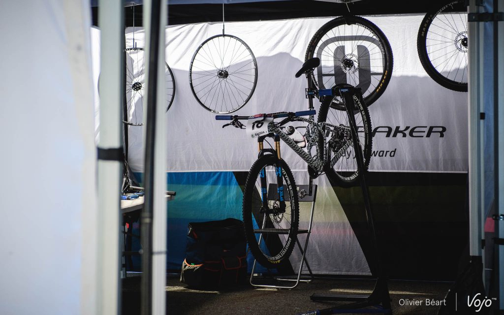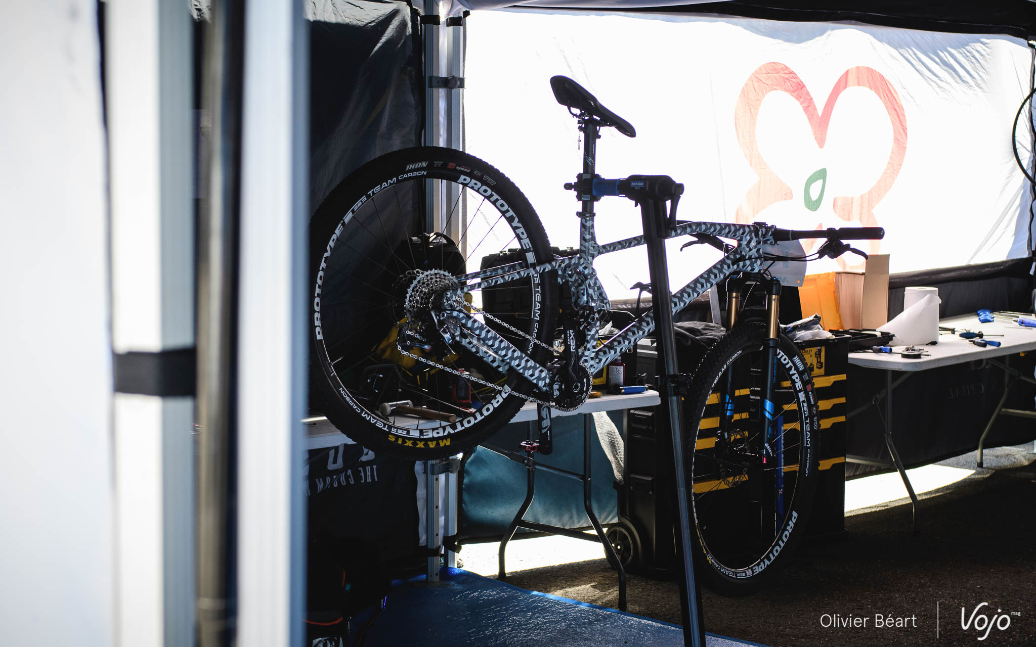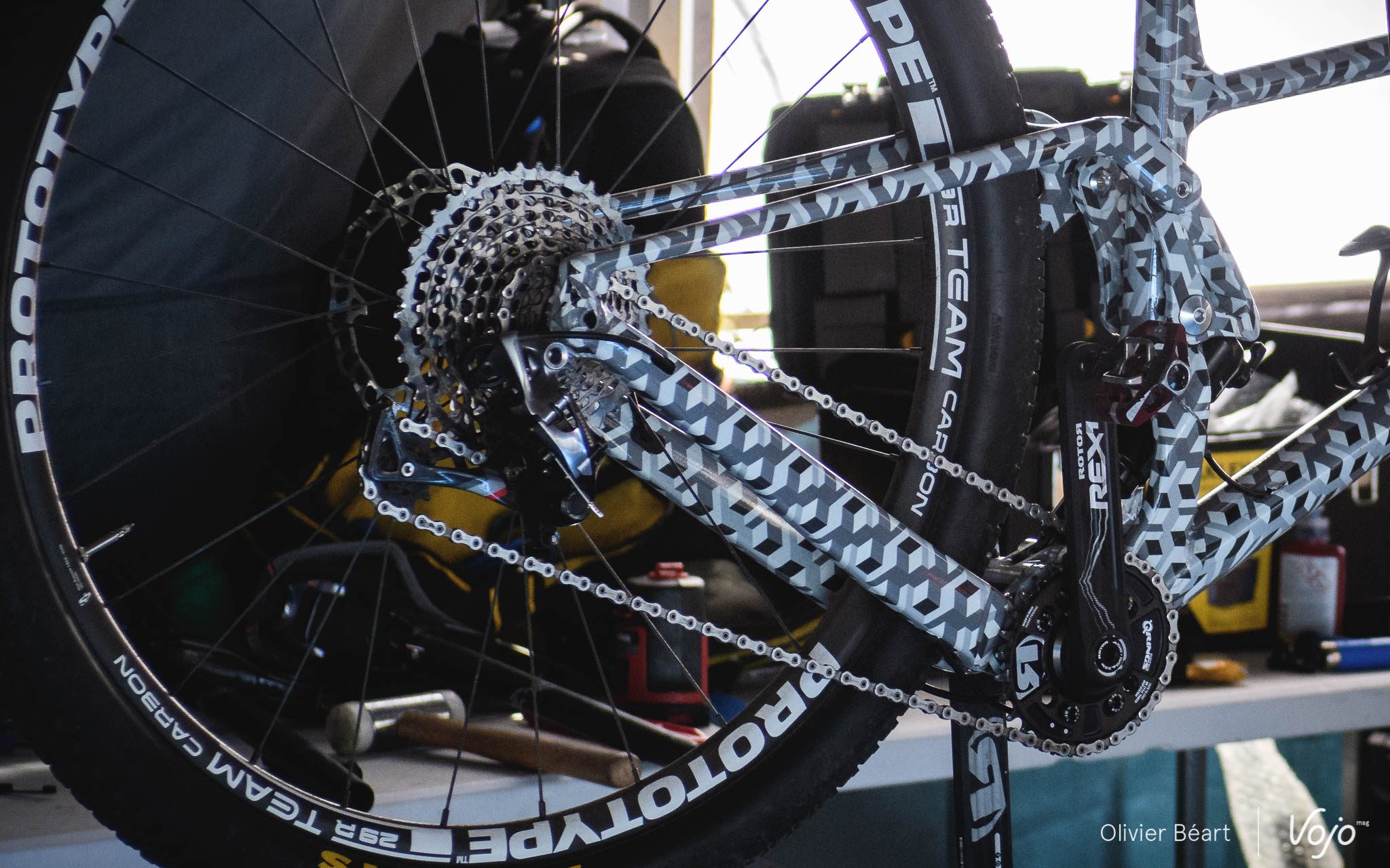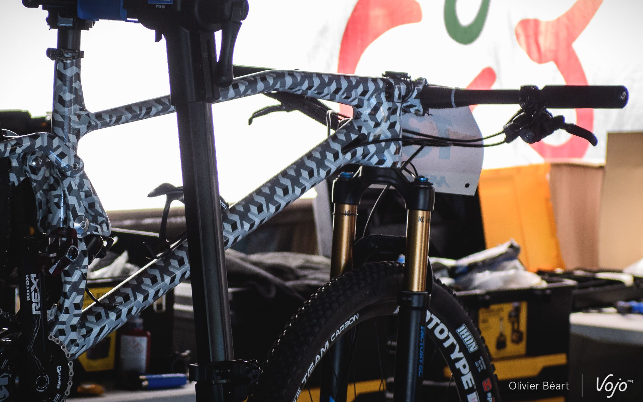 Aucune information ne nous a été communiquée par l’équipe, mais on imagine que le débattement sera de 100mm. Les roues sont bien évidemment en 29 pouces et l’arrière entièrement en carbone tout comme la biellette supérieure. Pour l’instant, la biellette inférieure est encore en aluminium et son caractère « brut d’usinage » suggère que des tests sont encore en cours à ce niveau.