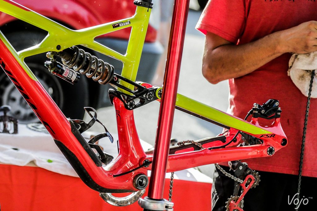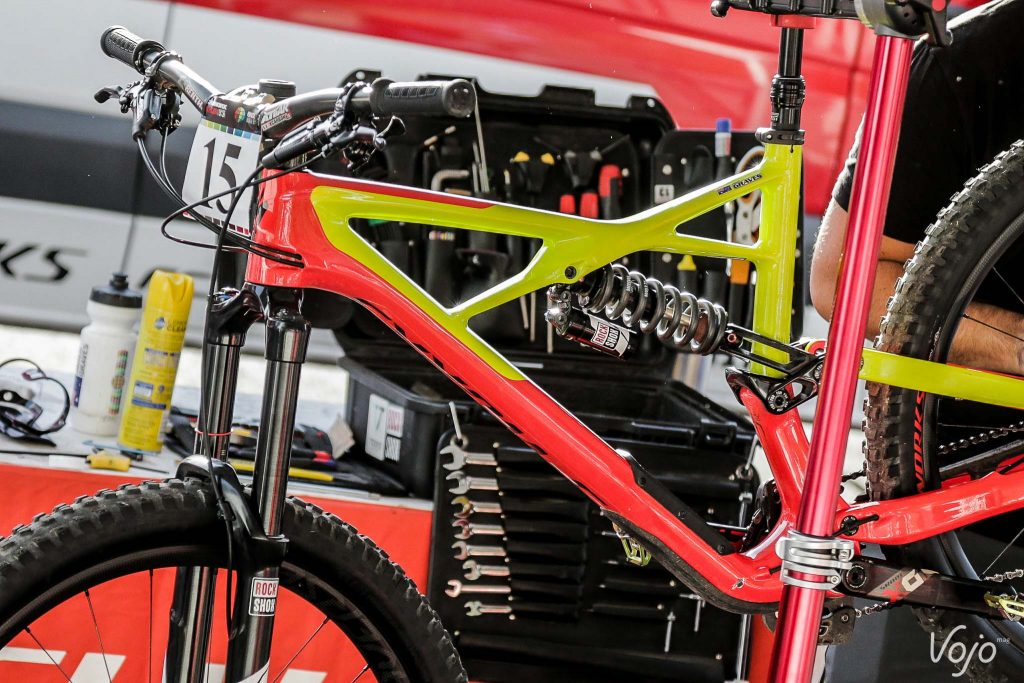 Les deux pilotes, sponsorisés Sram, ont fait le choix de suspensions RockShox et d’un amortisseur à ressort, mais les versions de série devraient se montrer moins radicales. Et, oh surprise au niveau du boîtier de pédalier, on constate un retour à de classiques roulements externes pour privilégier la fiabilité.