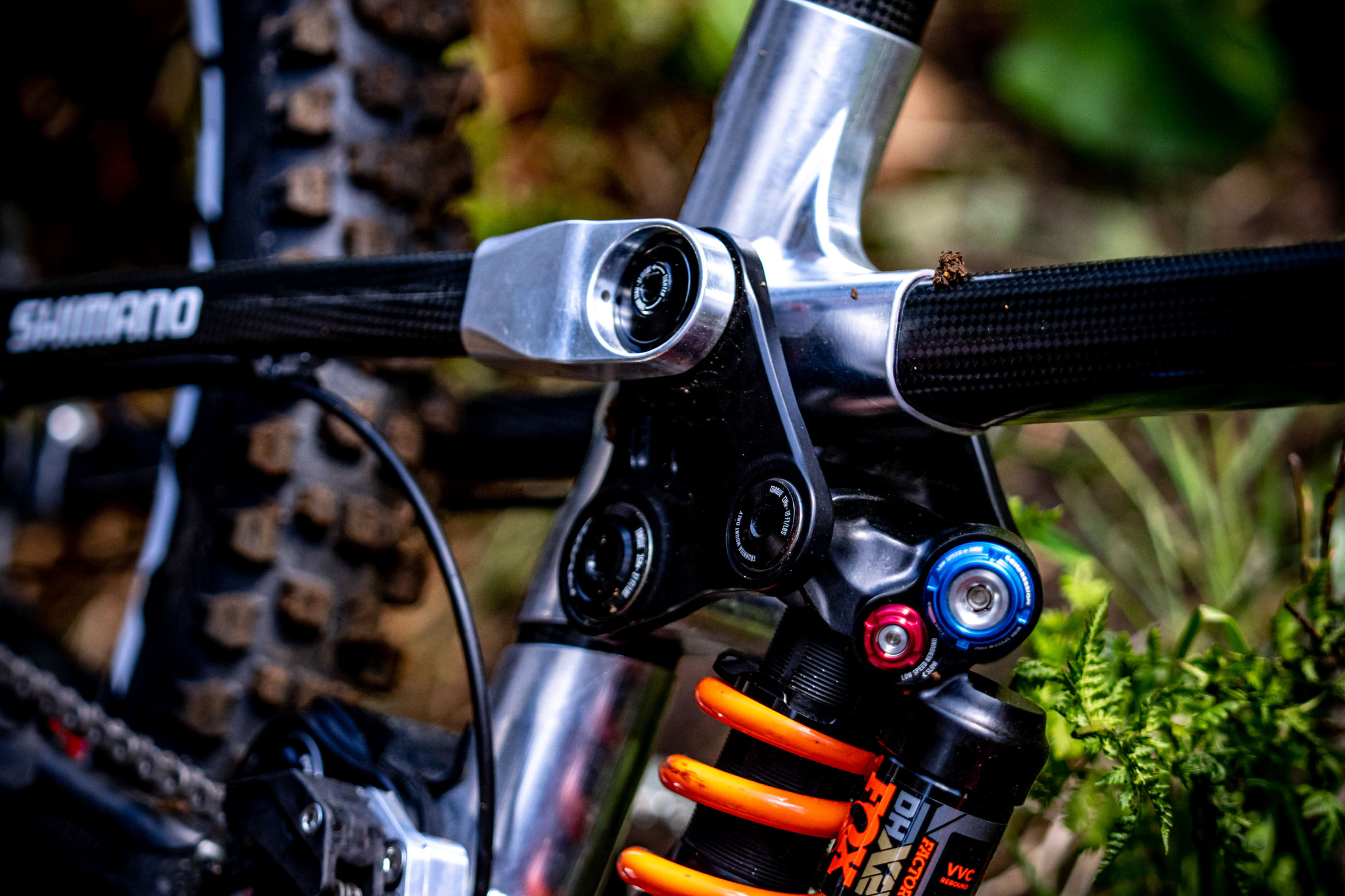 Ce cadre prototype utilise une construction en tubes de carbone associés à des raccords en alliage. Contrairement à la majorité des cadres dans le même style, tels que les Atherton Bikes, Pivot n’utilise pas la production additive (comprenez là l’impression 3D) pour fabriquer les raccords, mais favorise l’usinage CNC. Dans la même idée, le Specialized Demo de Loïc Bruni utilise également des manchons en aluminium.