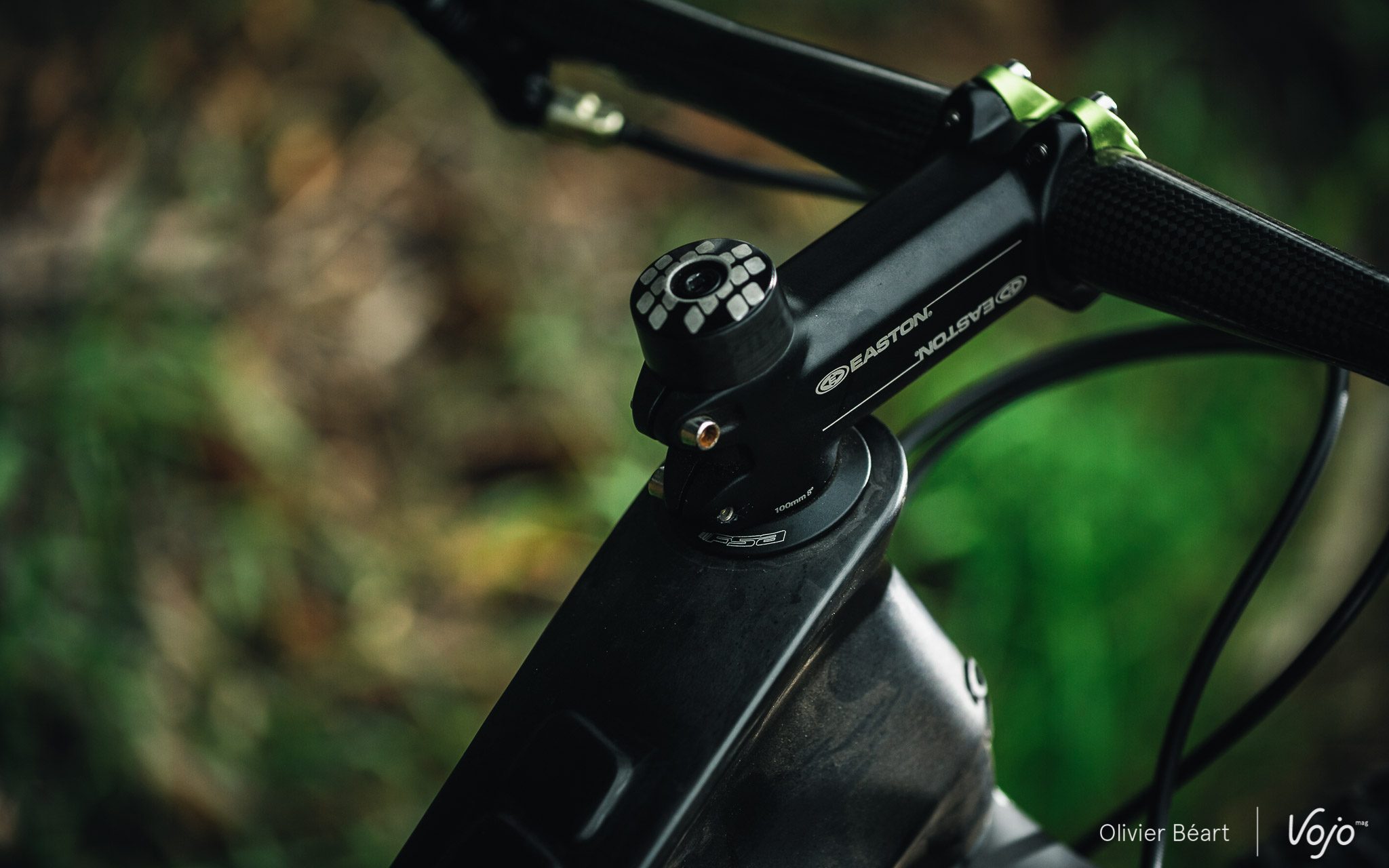 Autre élément distinctif, les quatre petites excroissance sur le tube supérieur, ainsi que la forme très particulière de la douille de direction qui intègre les entrées de câbles et Durit.