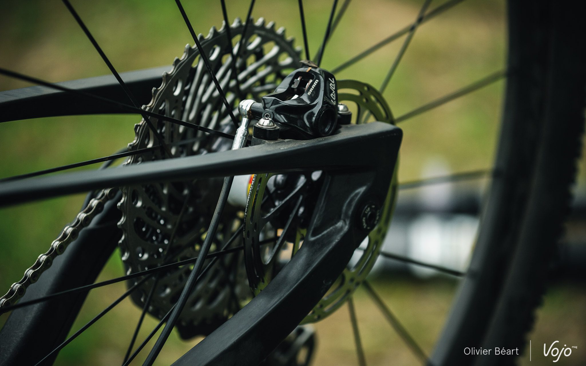 A l’arrière, le design des pattes rappelle très clairement le semi-rigide Prim en carbone. L’étrier de frein est fixé sur les haubans, directement à la bonne hauteur pour un disque de 160mm.