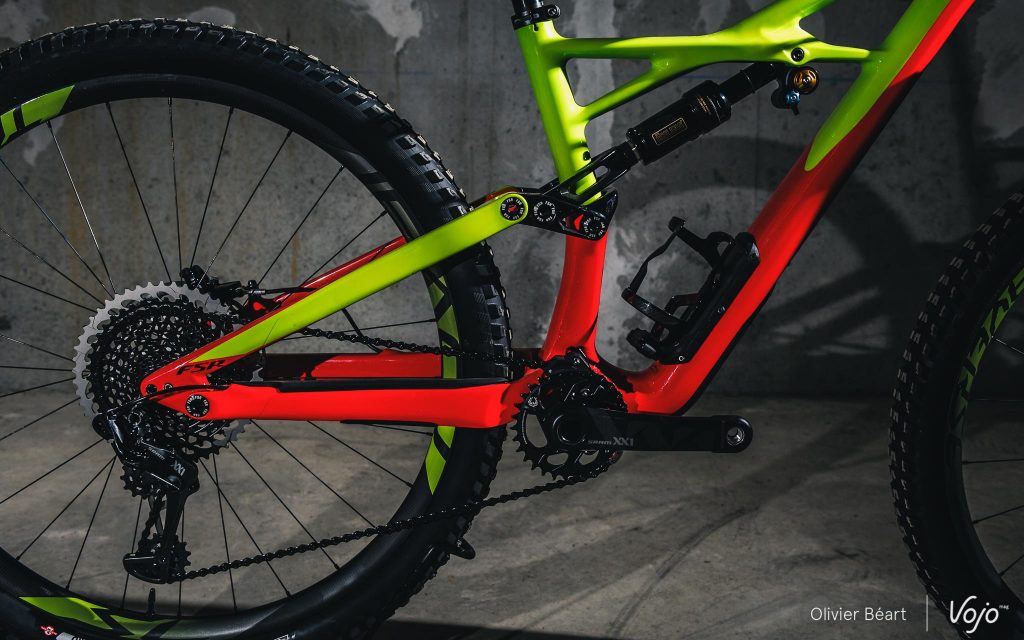 En zoomant sur l’image (en haut), on voit clairement que le positionnement de l’amortisseur change par rapport au modèle précédent (en bas à gauche). Il passe de haut en bas du cadre, au plus près du boîtier de pédalier, avec une construction qui s’inspire directement du nouveau Demo de DH, commercialisé depuis peu (image en bas à droite).
