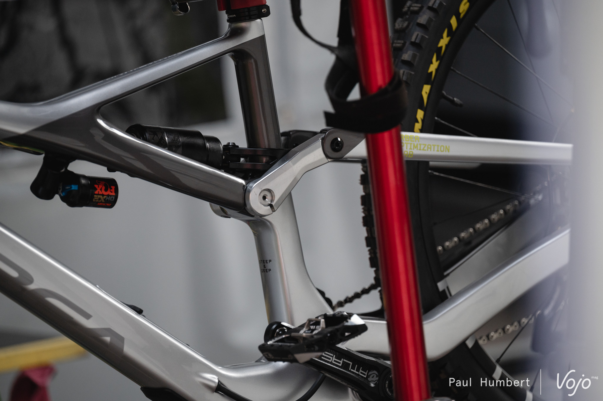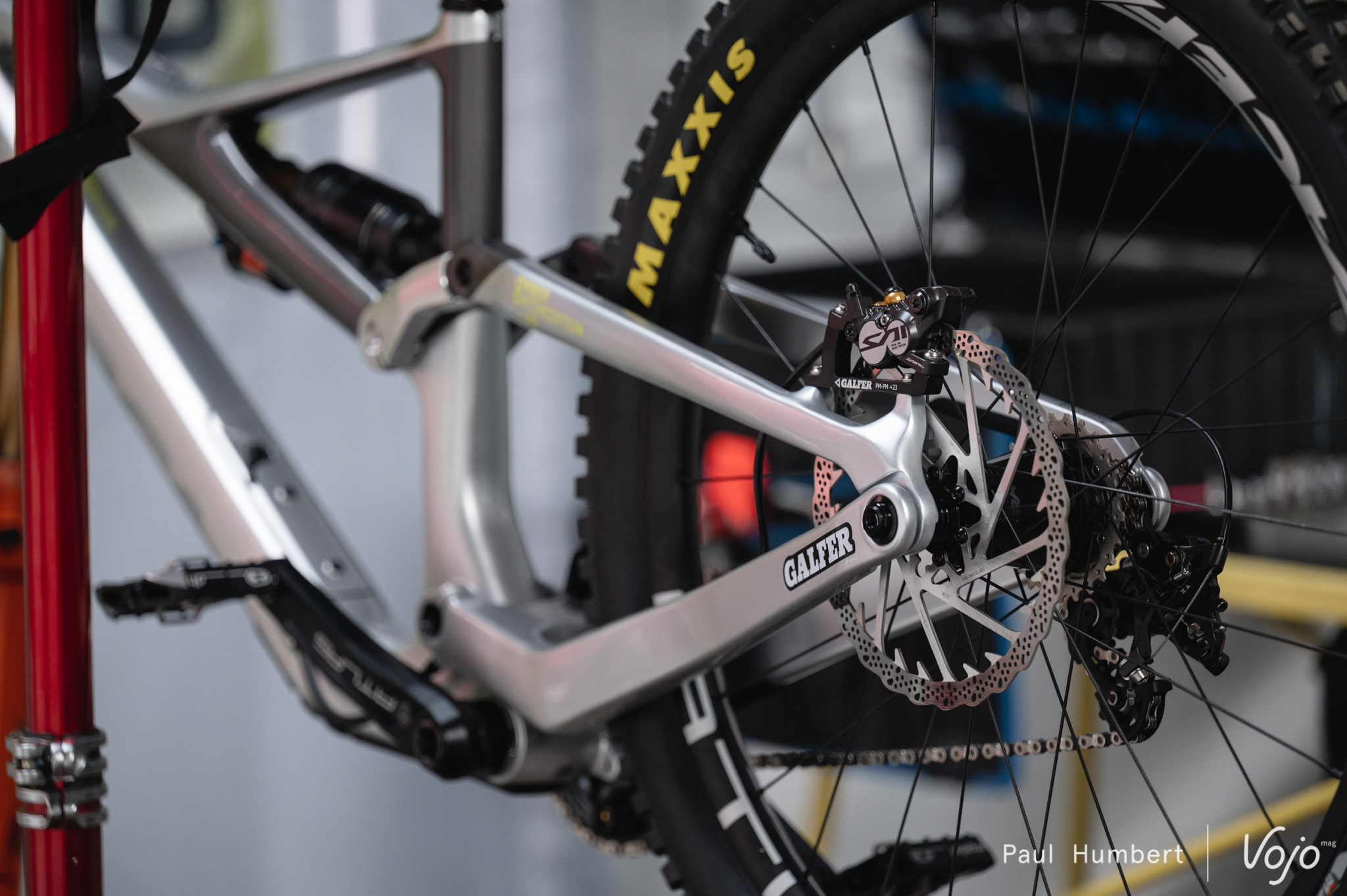 Pour le reste, on remarque la présence de roues Race Face Atlas, de pneus Maxxis prototype « Test Pilot », d’une transmission Shimano Saint avec des disques Galfer prototypes dotés d’ailettes de refroidissement.