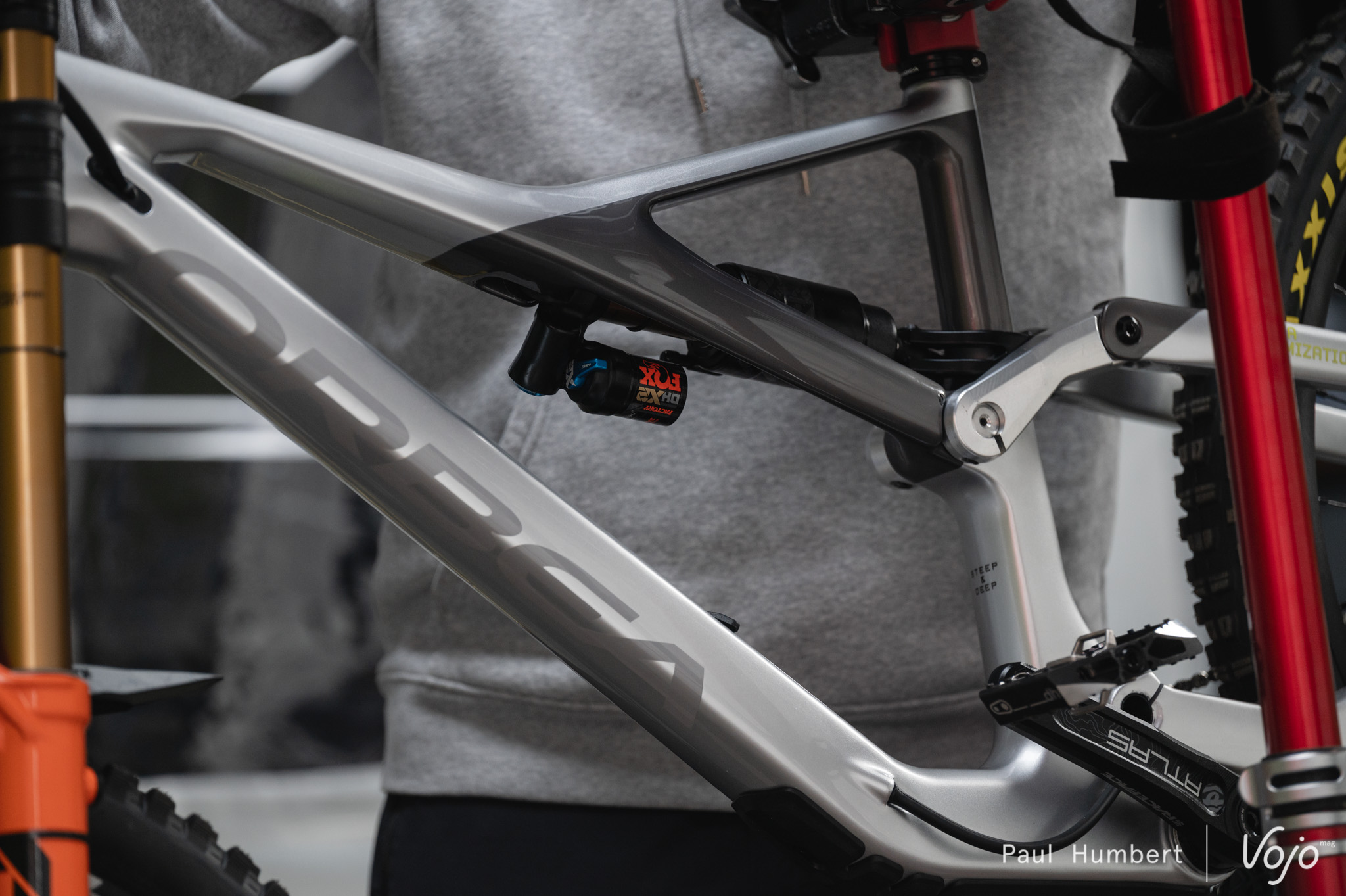 C’est assez logique : aussi efficace soit-elle, la suspension arrière de l’Orbea Rallon n’offre « que » 160mm de débattement, ce qui est fort juste en descente. On peut donc imaginer que cette biellette, combinée à un autre amortisseur, permette d’offrir plus de débattement. 180, 190, 200mm ? Impossible de le savoir à ce stade. Au-delà des chiffres, cette biellette permet probablement aussi, avec d’autres réglages de l’amortisseur, d’avoir un comportement de suspension plus adapté à la descente (plus de progressivité par exemple).