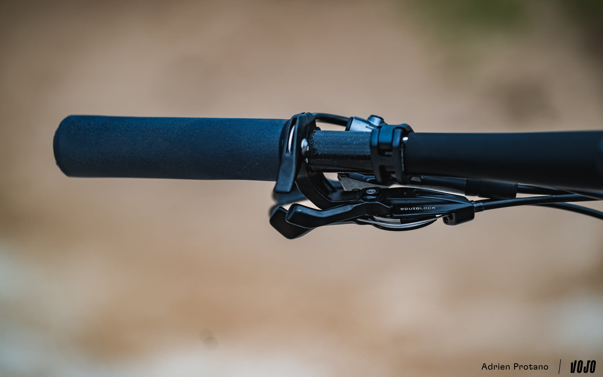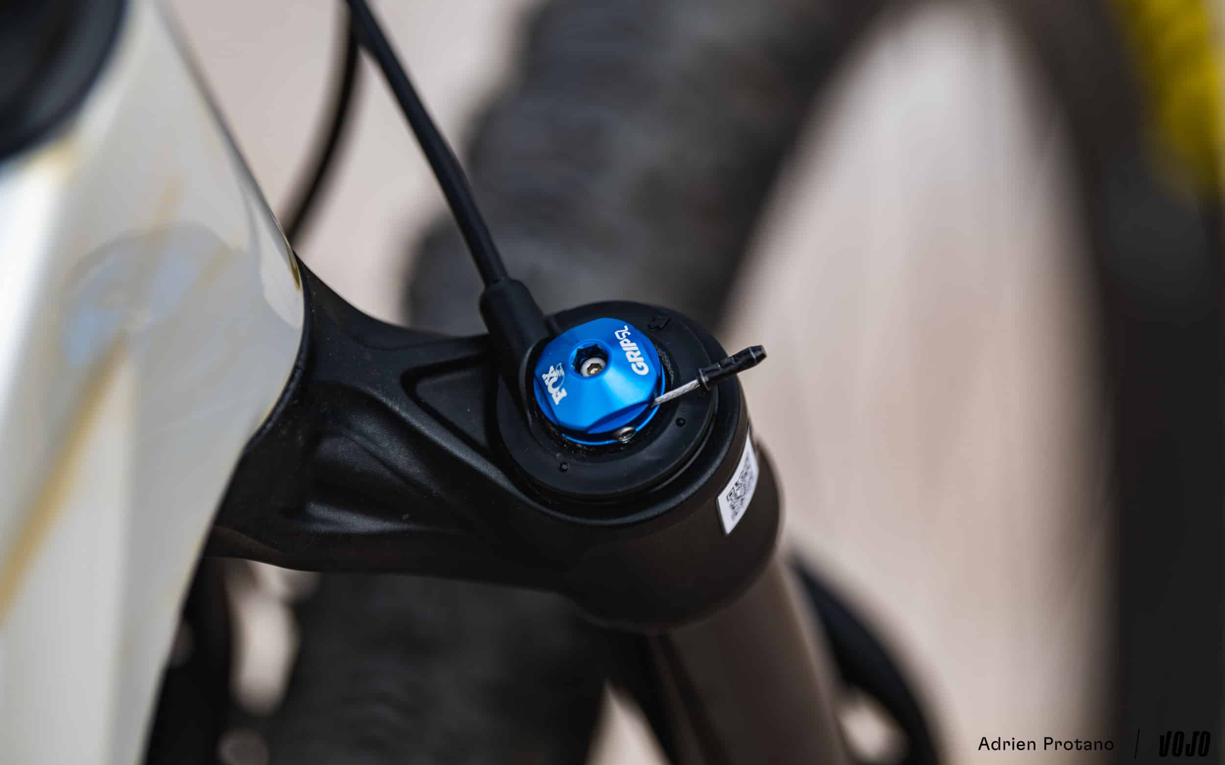 Cette fourche Fox est équipée d’un blocage au guidon, qui vient ici s’intégrer la commande Squid Lock du vélo du pilote (à savoir une commande au guidon propre à Orbea et permettant de bloquer à la fois la fourche et l’amortisseur, à l’image du TwinLoc de chez Scott par exemple).