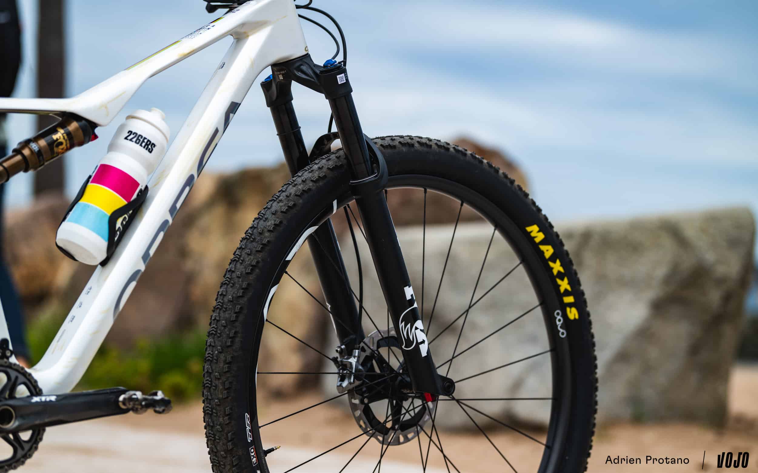 Lors de la tournée finale nord-américaine de la coupe du monde de cross-country, nous avons pu apercevoir une curieuse fourche équiper l’Orbea Oiz de Luca Martin. Présent pour rencontrer le public à l’occasion du Roc d’Azur, nous avons profité de l’opportunité pour que le Français nous présente son vélo à la livrée personnalisée pour son titre de champion du monde U23 XCO, ainsi que cette fourche prototype de Fox Float 34 :