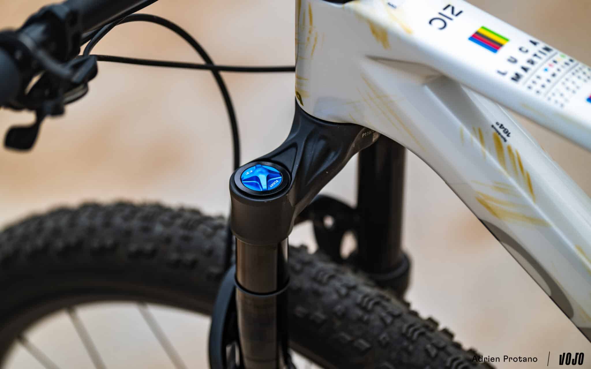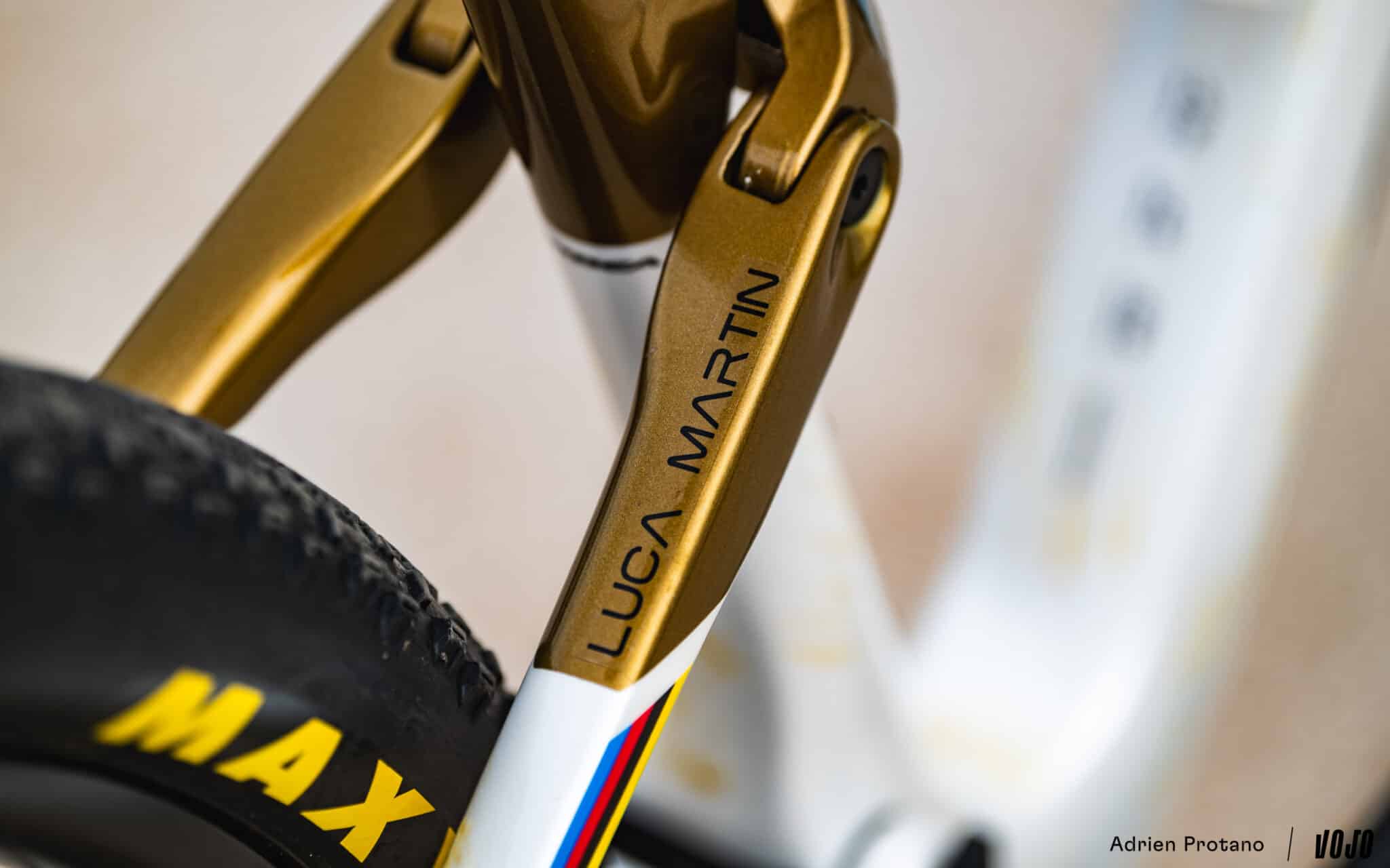 Lors de la tournée finale nord-américaine de la coupe du monde de cross-country, nous avons pu apercevoir une curieuse fourche équiper l’Orbea Oiz de Luca Martin. Présent pour rencontrer le public à l’occasion du Roc d’Azur, nous avons profité de l’opportunité pour que le Français nous présente son vélo à la livrée personnalisée pour son titre de champion du monde U23 XCO, ainsi que cette fourche prototype de Fox Float 34 :