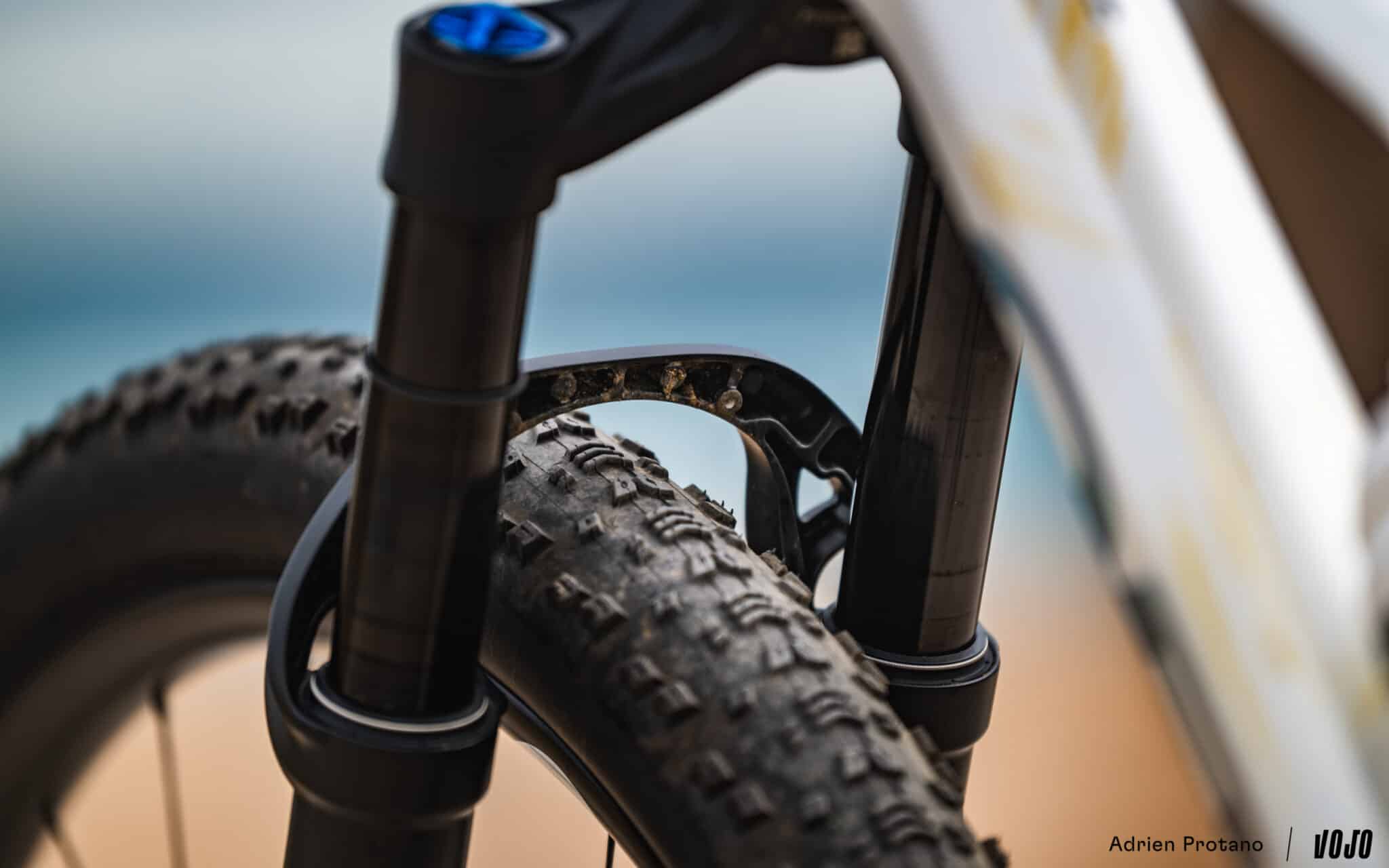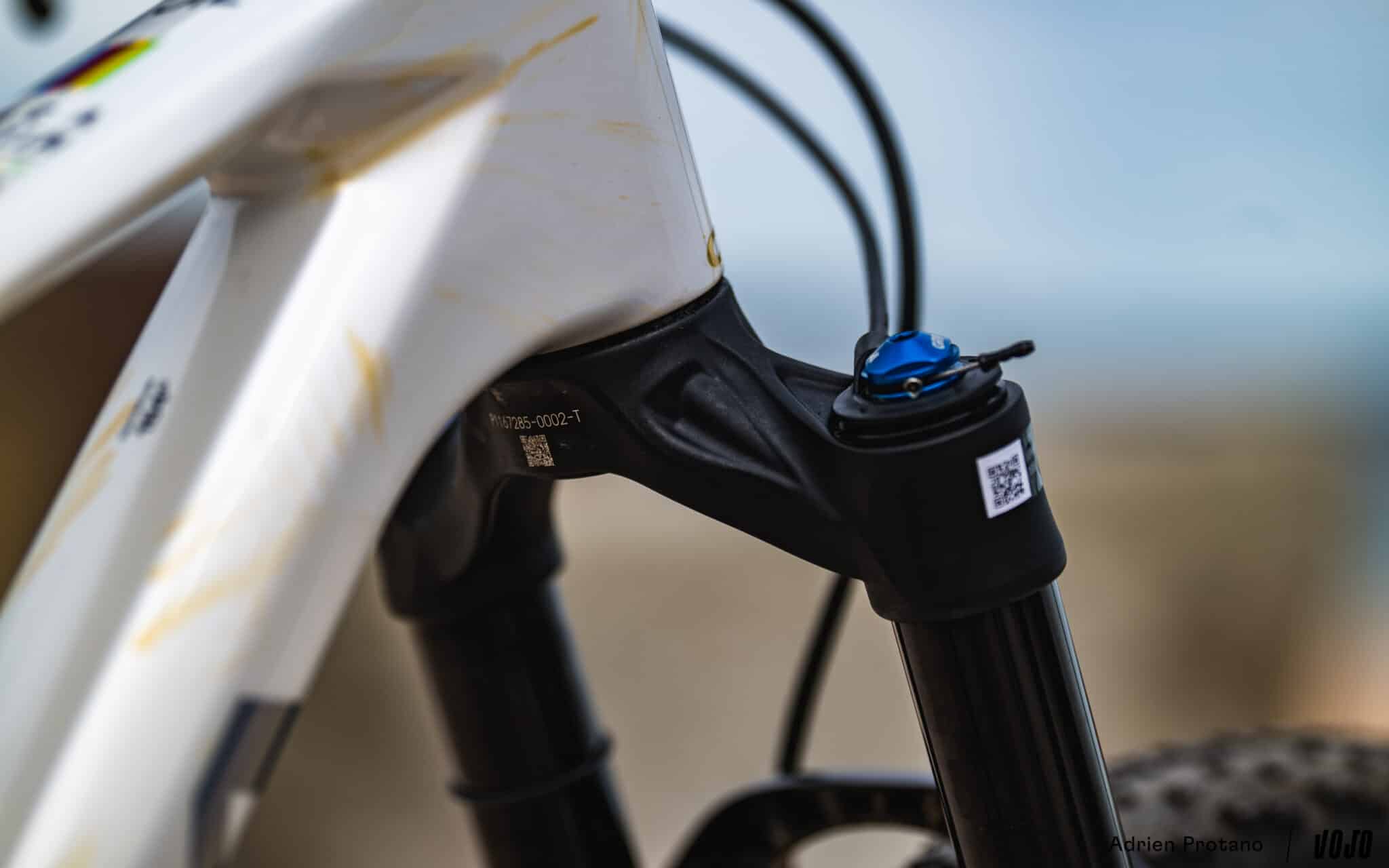 Selon le pilote français, ce prototype n’afficherait pas de changement au niveau de la cartouche. Pourtant, son ressenti sur le terrain a été bien différent par rapport à la précédente fourche équipant son vélo : « C’est vraiment beaucoup plus rigide. À tel point que j’ai dû revoir légèrement mes réglages de pression à la baisse. J’ai également testé différentes roues pour contre-balancer un peu cette rigidité de l’avant, qui ne s’accordait pas tout à fait correctement avec le reste du cadre », détaille Luca.
