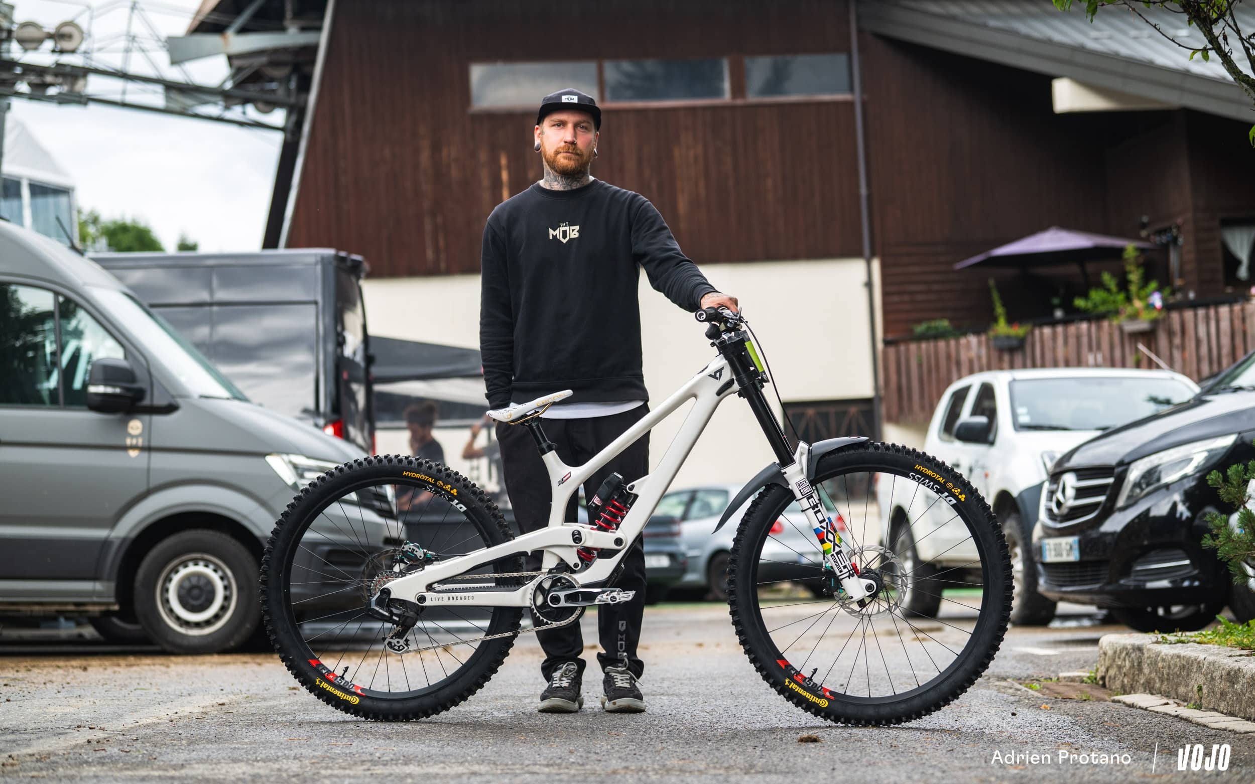 Depuis son arrivée en Coupe du monde, Vali Höll est régulièrement aux avant-postes quand il s’agit de tester du matériel inédit. Et ce week-end aux Gets, la pilote autrichienne a une nouvelle fois attiré tous les regards… Avec ce dérailleur inédit aux airs de T-Type, tout porte à croire que Sram est en train de peaufiner une version spécifique descente de son groupe électronique. Curieux de lever le voile sur cette rumeur, nous sommes allés faire un tour dans les paddocks, direction le stand du YT Mob…
