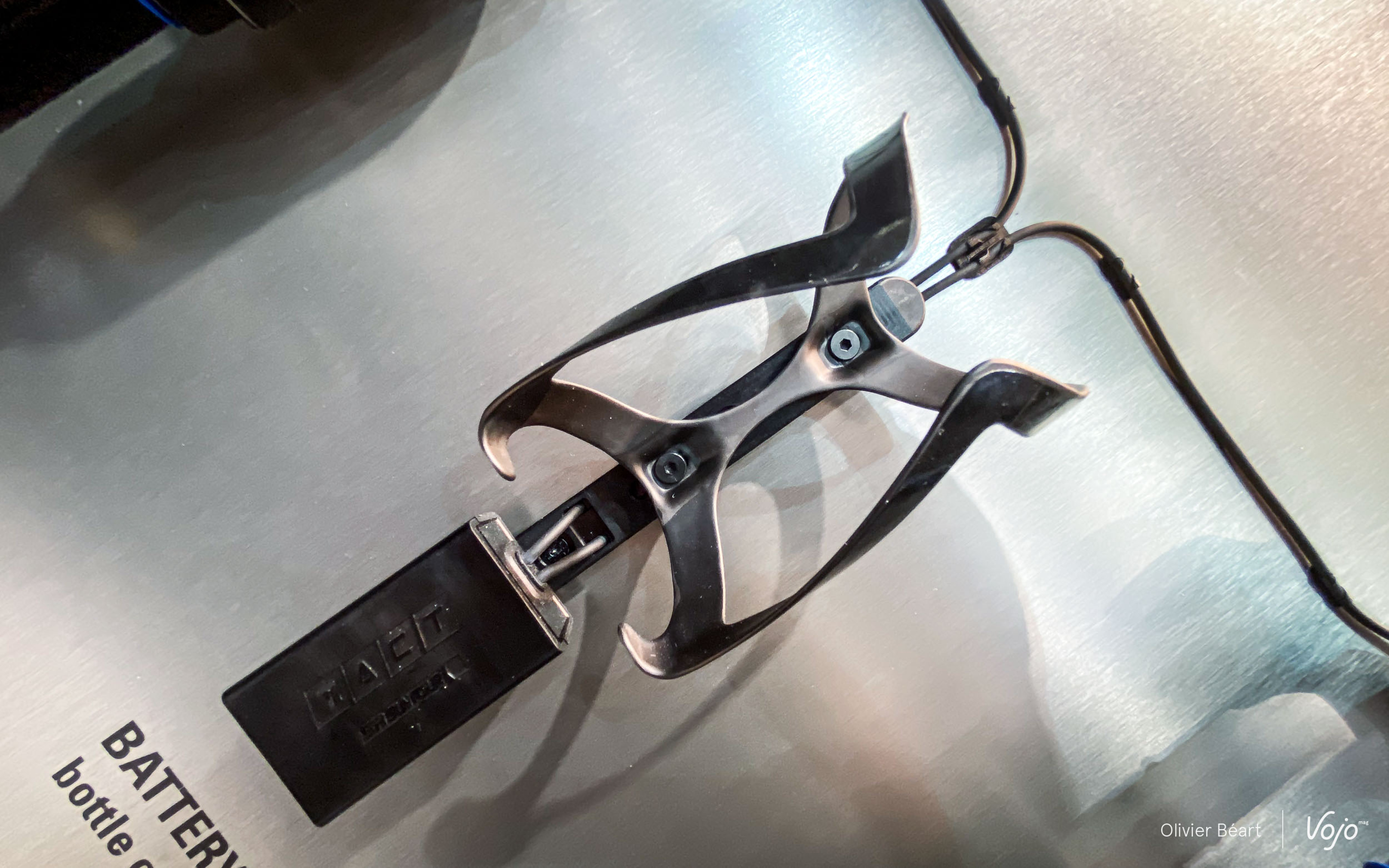 Dernière pièce du puzzle, la batterie centrale reliée à la fois à l’amortisseur et à la fourche. Si Sram a logiquement décidé de doter ses suspensions Flight Attendant de batteries AXS, c’est ici une batterie unique située sur le porte-bidon qui alimente ces suspensions électroniques SR Suntour. Un support dédié pour recevoir cette batterie, tout en permettant l’usage du porte-bidon, est fourni par la marque.