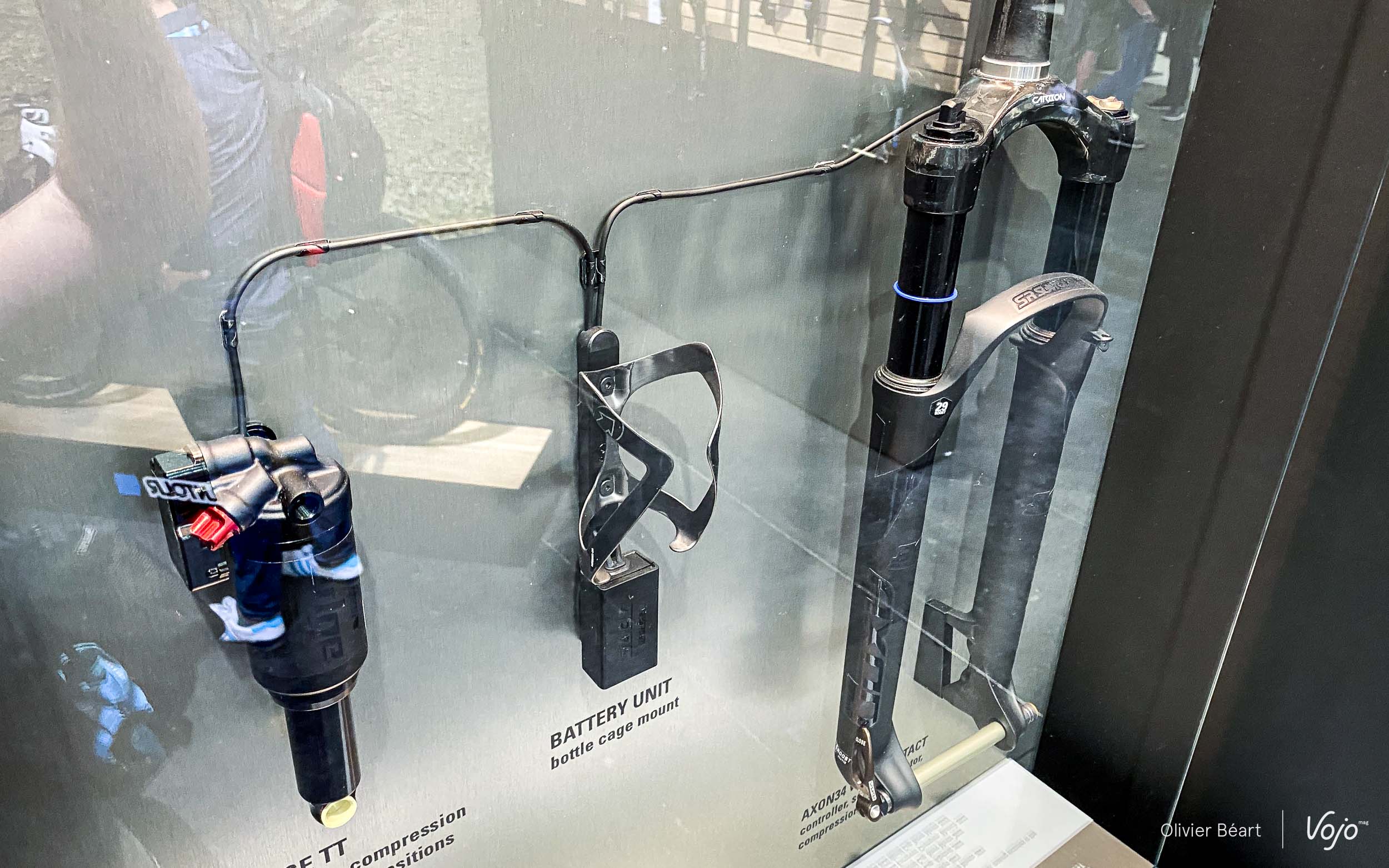 Pas d’amalgame, si le système est électronique, il n’est pas sans fil pour autant : les trois éléments distincts du système (fourche, amortisseur et batterie) sont reliés par un simple câble. C’est la meilleure solution, selon la marque, pour obtenir un système suffisamment rapide avec une analyse toutes les 4 millisecondes, soit plus de 80 analyses le temps d’un clignement d’œil…