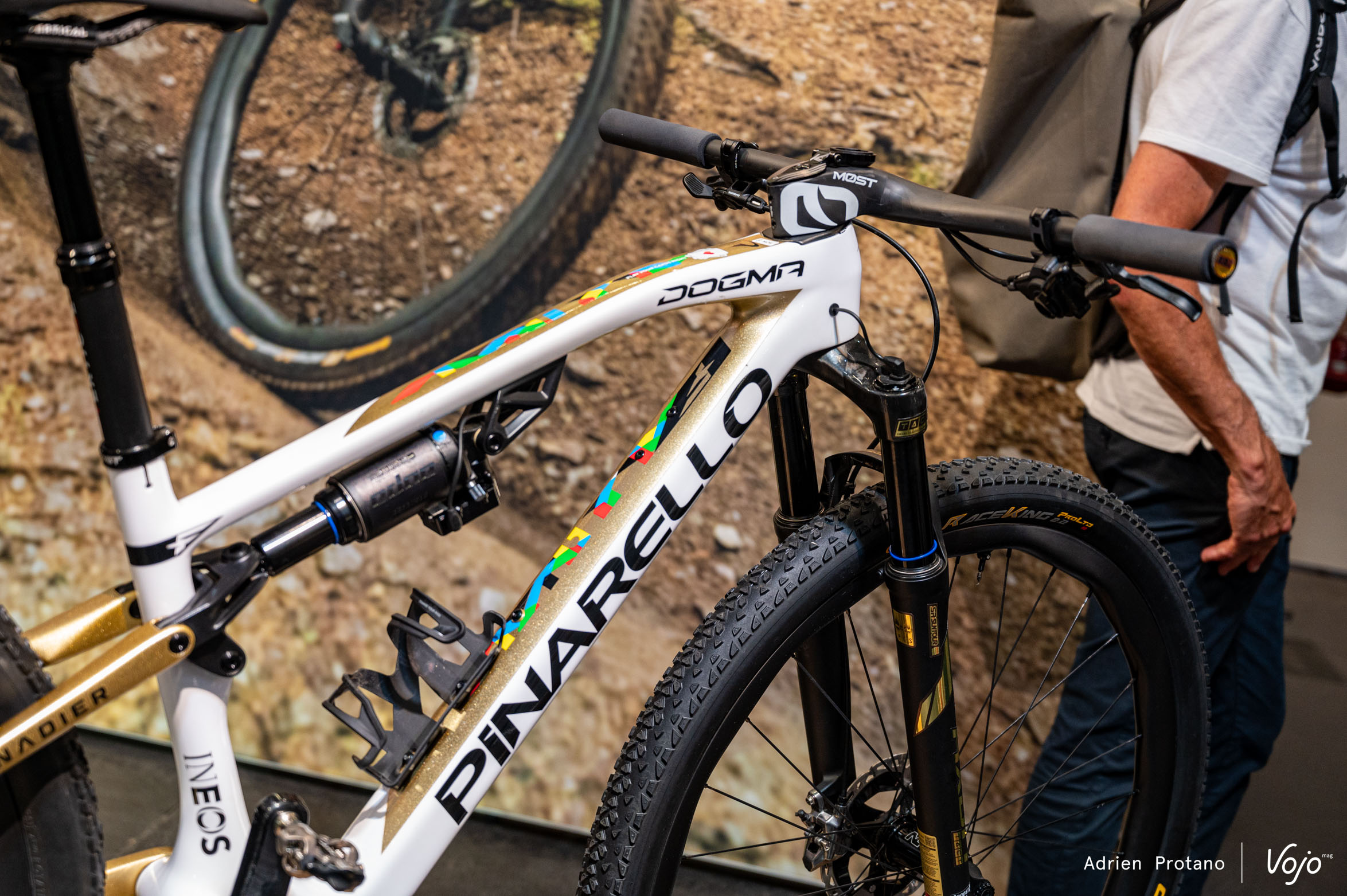 Les plus attentifs auront remarqué qu’aucune batterie ne figure sur le Pinarello Dogma XC de Tom Pidcock ici photographié (ou de Pauline Ferrand-Prévot). La marque explique que la batterie a été cachée à l’intérieur du cadre pour les deux pilotes, et qu’une telle intégration est prévue à l’avenir pour les modèles de série.