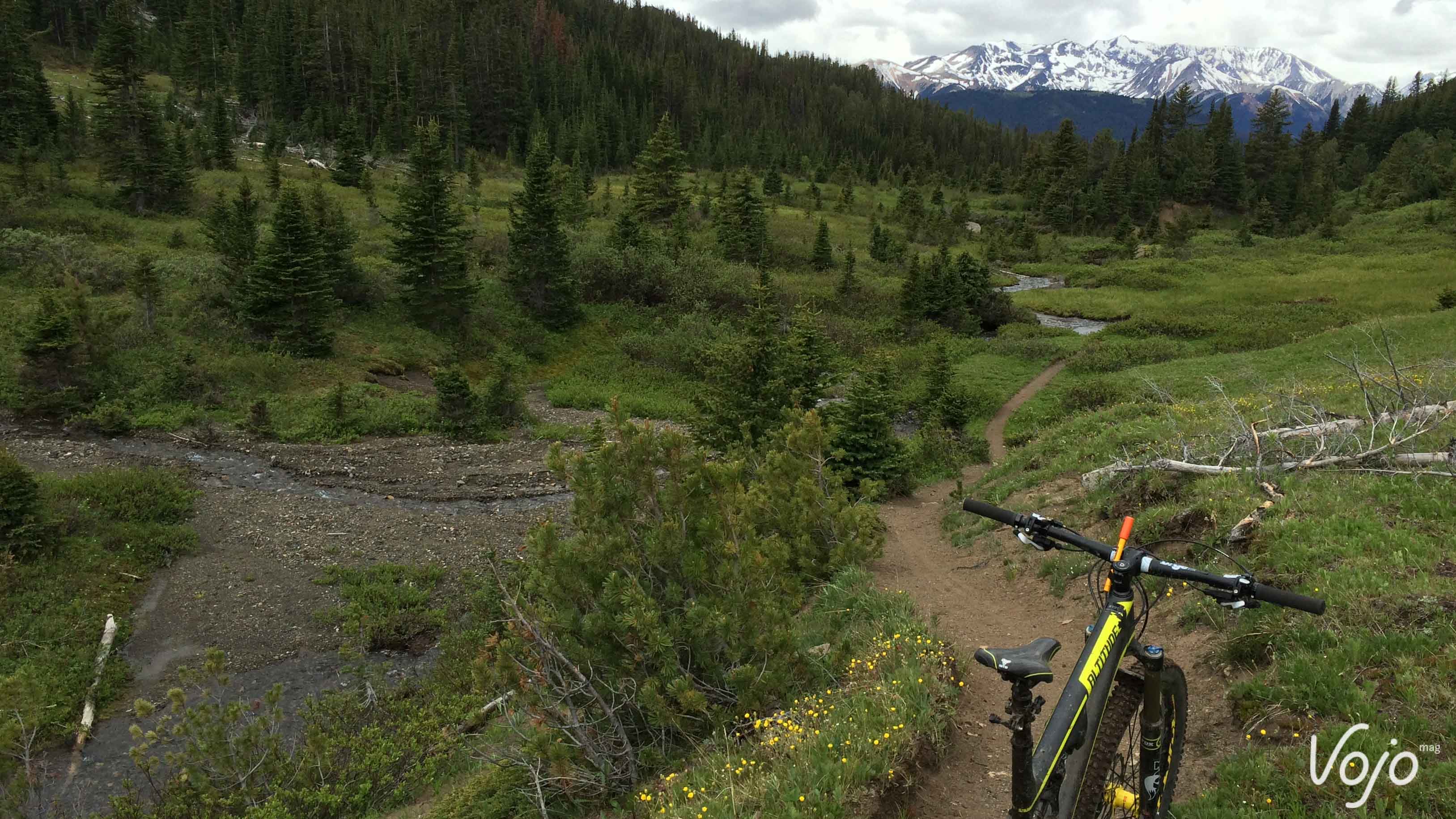 Mon périple en autonomie commence bien, même si je n’ai pas vraiment l’habitude de porter un sac aussi gros. Je me régale sur les sentiers roulant et ludiques. Ils n’ont rien à voir avec ceux des Alpes, des Andes ou de l’Himalaya. En roulant, je m’enfonce dans les montagnes, je découvre les lacs et la beauté des terres presque intactes. Ici, il n’y a pas de routes, pas de villages ni de câbles. C’est magnifique. Depuis le haut des cols, les descentes sont enivrantes jusqu’aux lacs ! Je n’oublie pas de crier et de chanter pour prévenir les habitants du coin : Les grizzlis. Il faut en être conscient, le coin est connu pour en regorger ! C’est d’ailleurs pour cette raison que mes camarades de chez Rocky m’ont prêté un téléphone satellite, une bombe au poivre et un « machin-qui-explose-pour-faire-peur-au-grizzly ». J’espère ne pas avoir à me servir de tout ça !