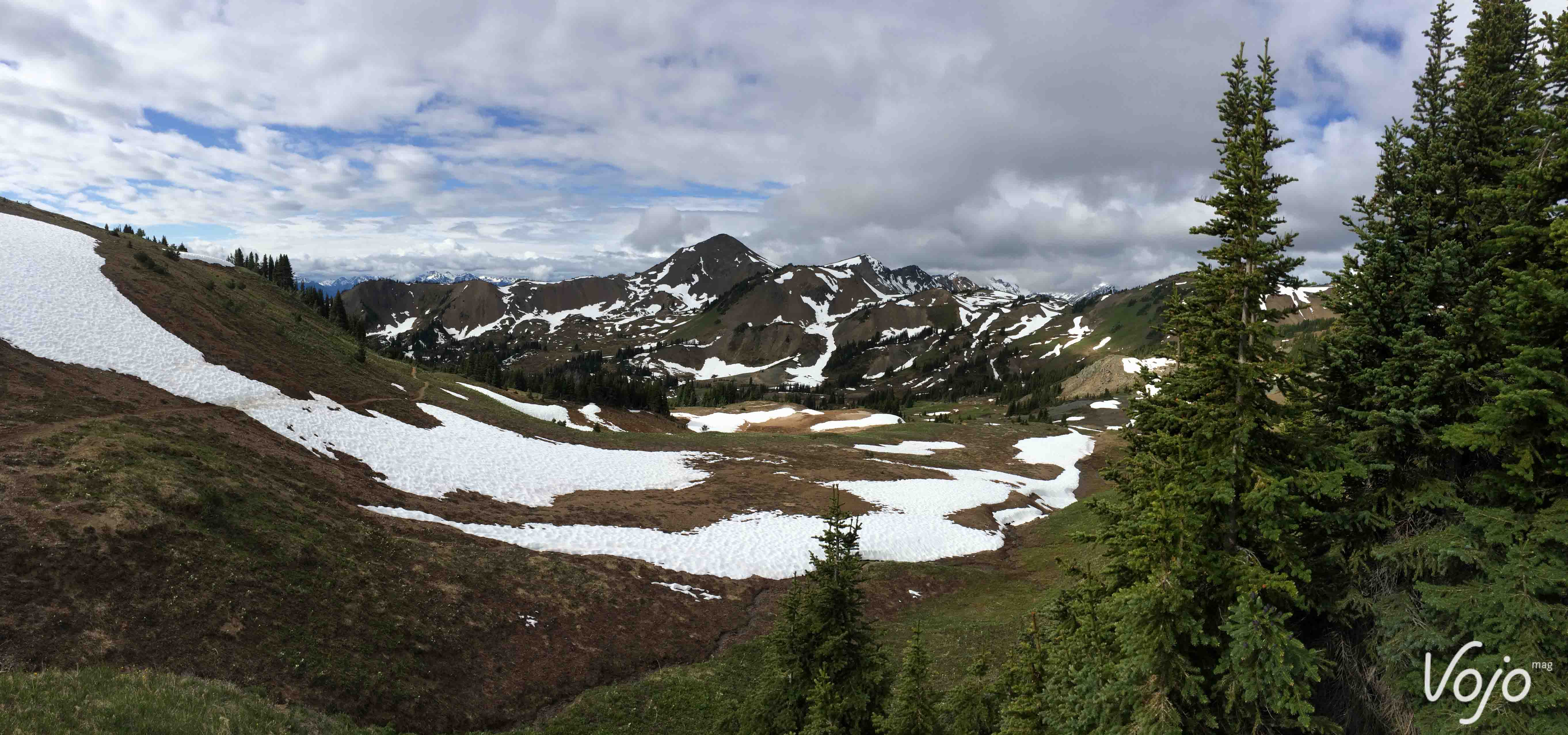 Le matin suivant, un aigle à tête blanche pèche sur le lac, la brume se dissipe et je mange un petit-déjeuner en compagnie de mes nouveaux amis. La nature est calme et la rosée me rafraichit les mollets quand je repars sur les sentiers. Je pars en quête de liberté et de sensations. Cette dernière journée est magique et silencieuse, j’avale beaucoup de dénivelé mais je sais déjà que mon retour à Vancouver approche. Les descentes sont folles, je traverse des rivières le vélo sur le dos, je roule dans la neige et je me régale. Alors que je ne m’y attendais plus, je croise un magnifique grizzly sur mon sentier! Quel moment intense, la bête est a quelques mètres seulement et elle s’apprête à venir vers moi. Je lui hurle dessus et elle retourne finalement vers ses petits restés derrière les arbres. Ma caméra était éteinte à ce moment mais cette rencontre restera gravée dans ma mémoire.