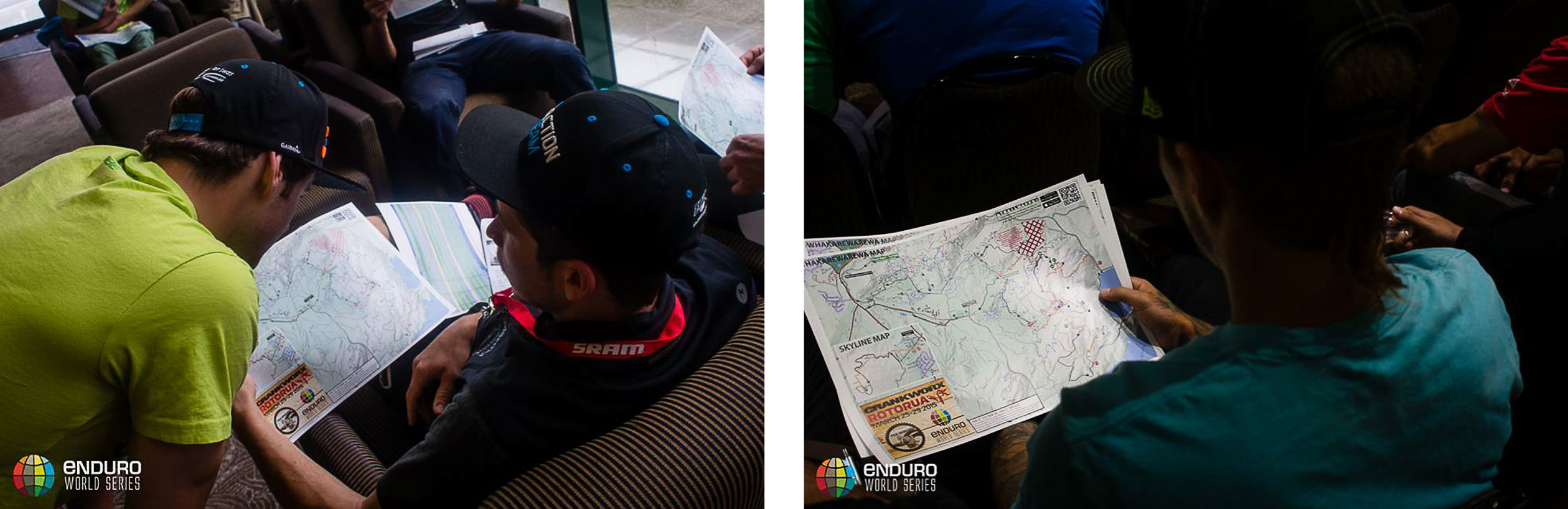 Les meilleurs pilotes de la scène enduro sont donc tous à l’autre bout de la planète pour ce qui s’annonce comme une épreuve spectaculaire et plutôt solide avec pas moins de 60km, 1700m de d+ et 1800m de d- dans la la jungle de Whakarewarewa (à vos souhaits) ! Rendez-vous en bas de l’article si vous souhaitez télécharger la carte des spéciales que Nicolas Lau, Greg Callaghan et Sam Hill étudient attentivement.
