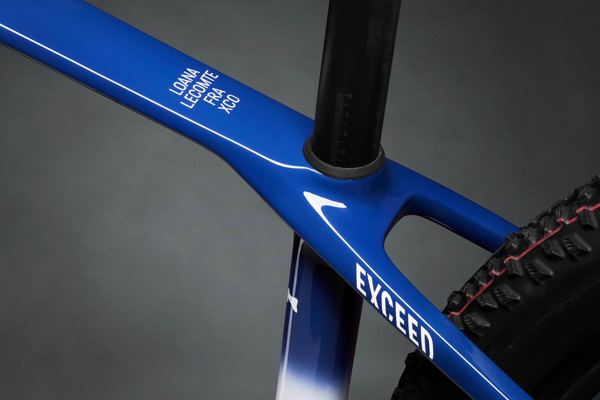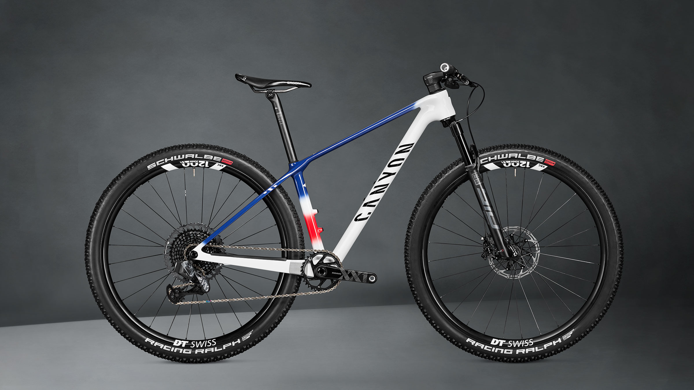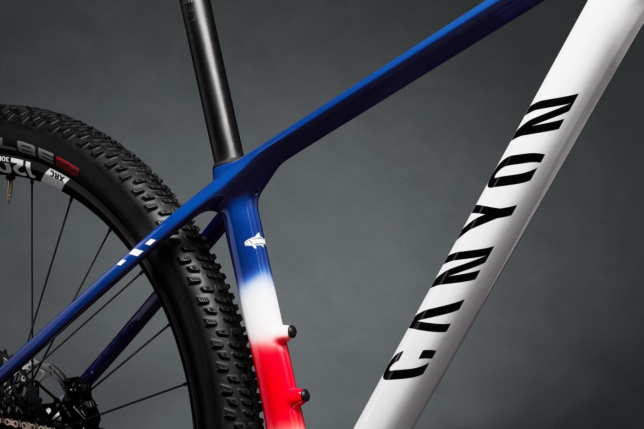Canyon nous a habitué à des peintures personnalisées pour Mathieu Van der Poel et le Canyon CLLCTV XCO aura vraisemblablement droit au même traitement puisque les vélos ont été présentés dans une édition spéciale bleu-blanc-rouge, en écho au titre de championne de France de Loana Lecomte.
