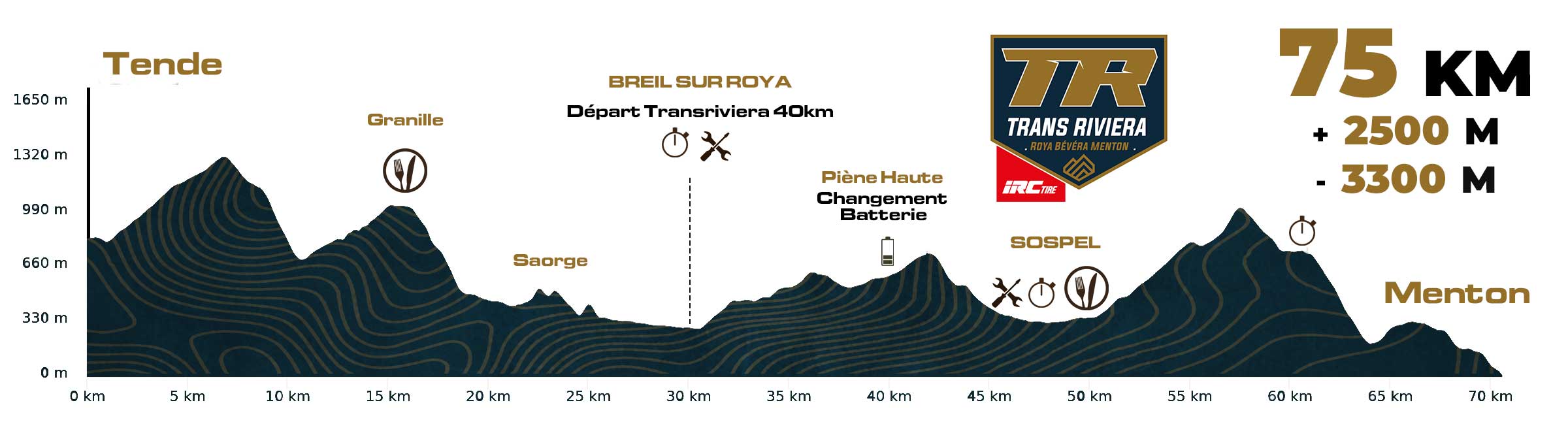 Pour celles et ceux qui souhaiteraient faire plus court, il est possible de s’élancer depuis Breil sur Roya, ce qui ramène le parcours à 40km et 1800 m de D+. Il s’agit d’une course distincte qui emmène les participants sur le magnifique tronçon final de la TransRiviera 75 km.